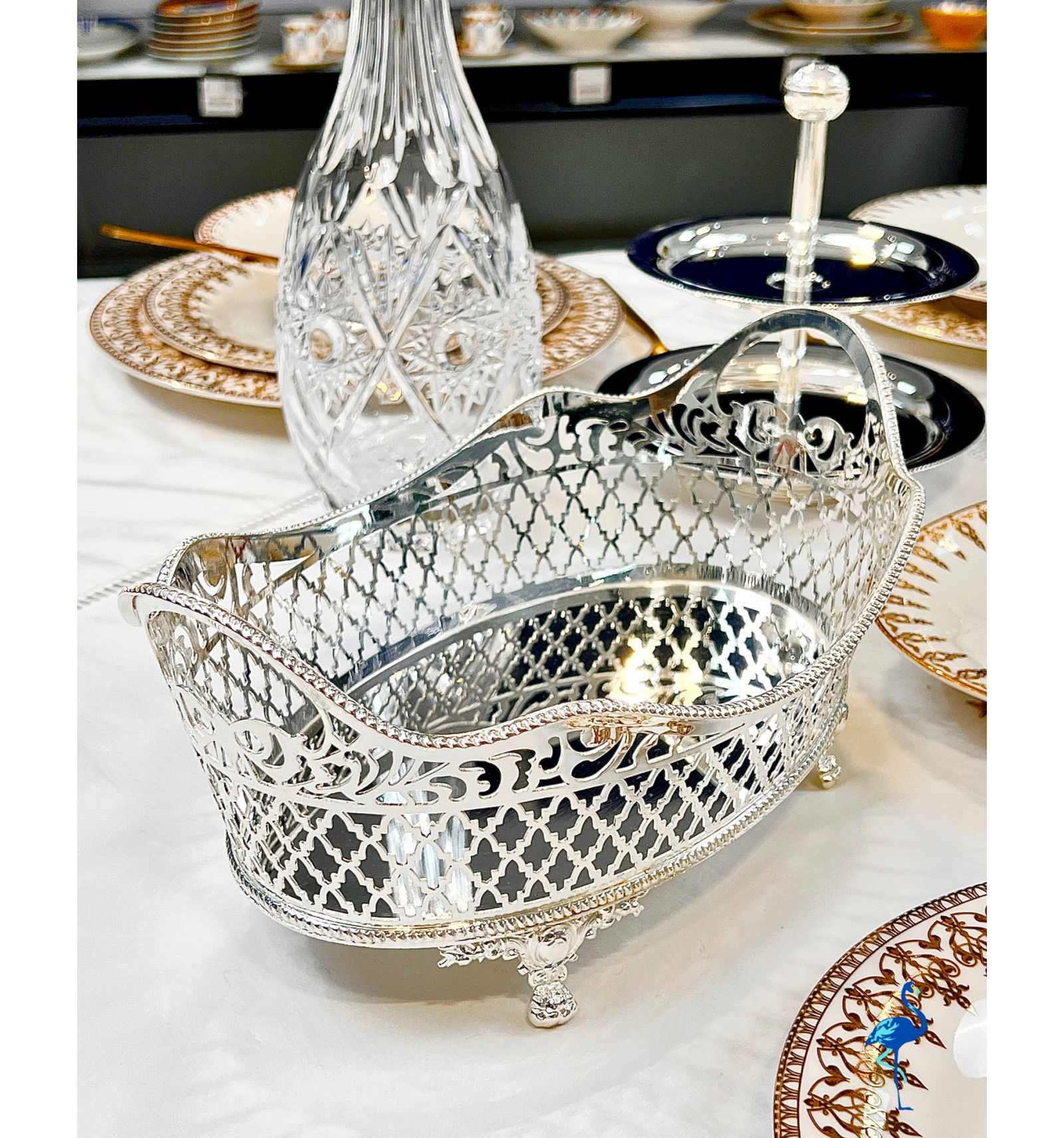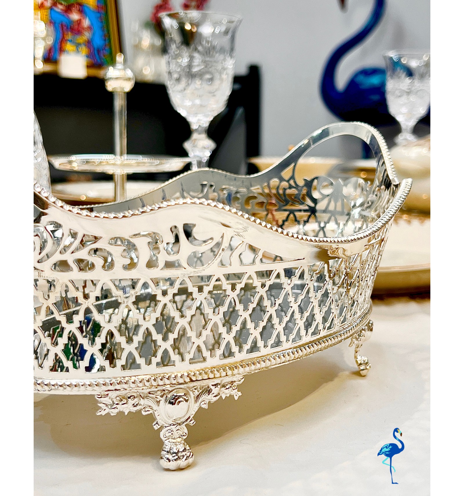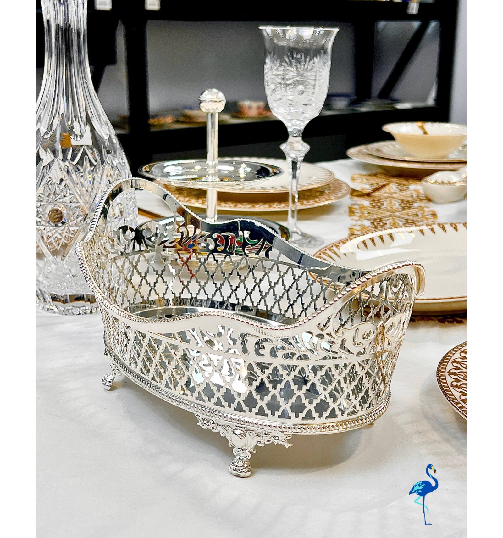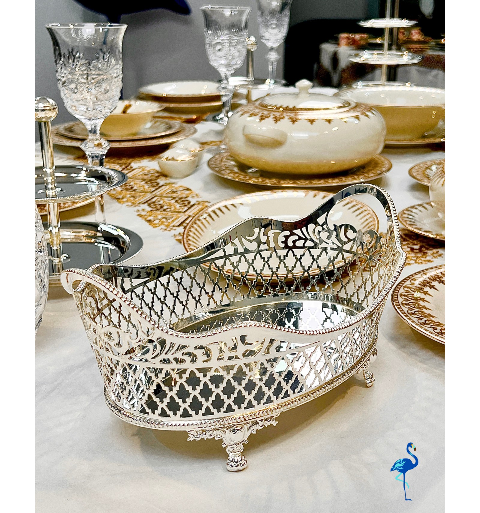 Sublimez votre table avec ce panier à pain en argent au design raffiné et aux finitions délicatement ciselées. Son motif ajouré d’inspiration orientale apporte une touche d’élégance et de sophistication à votre art de la table.