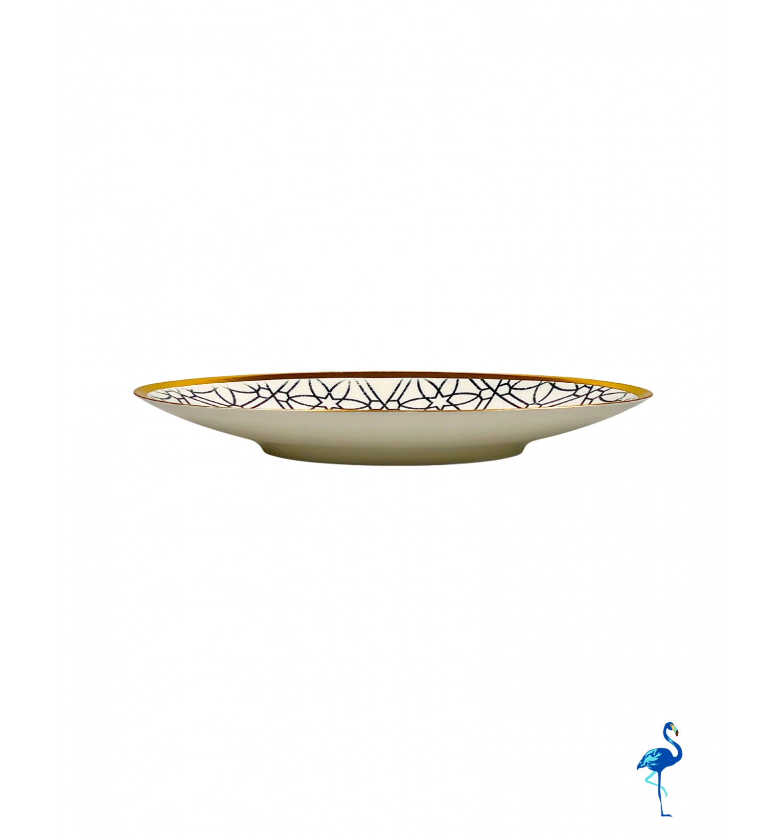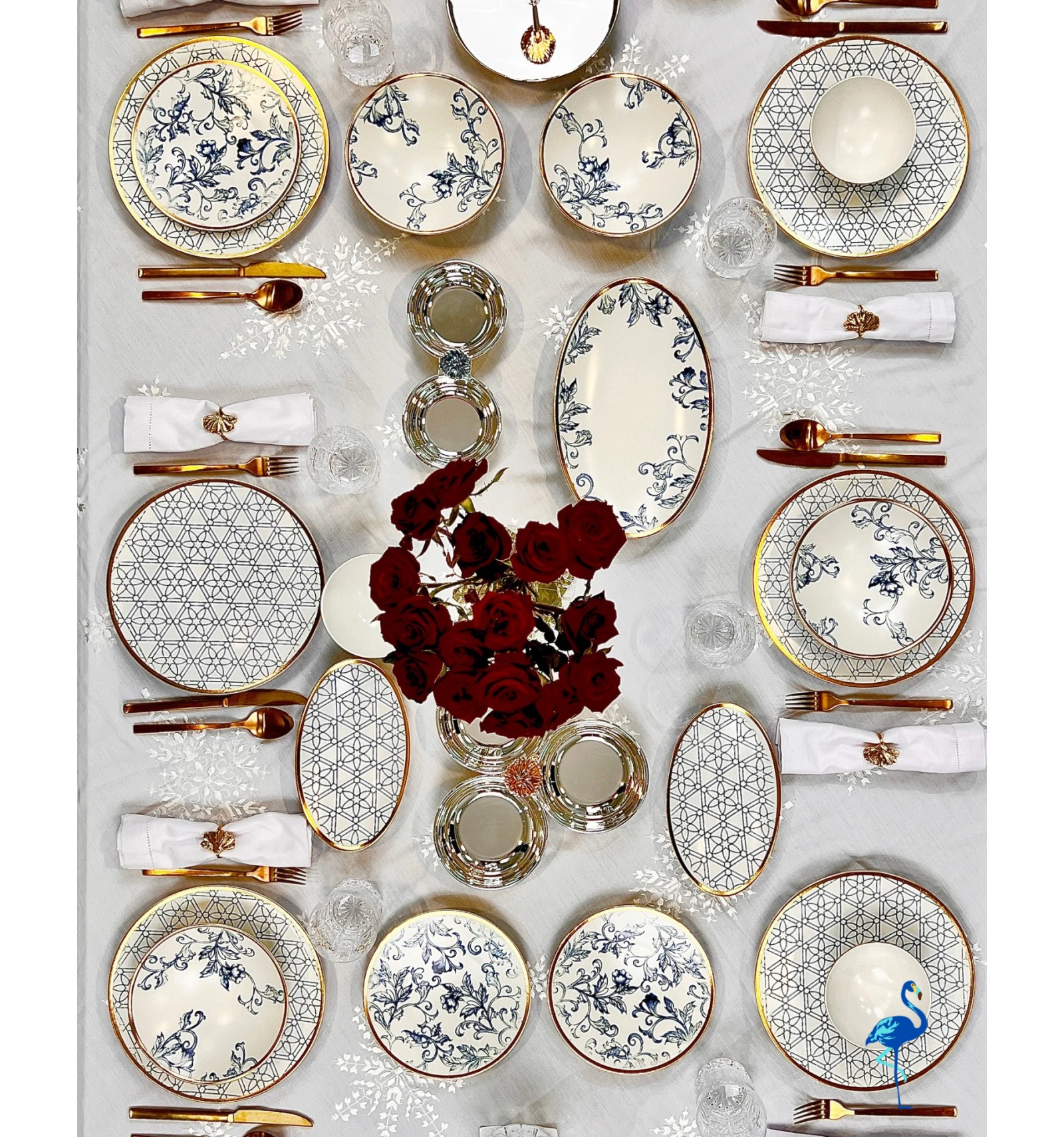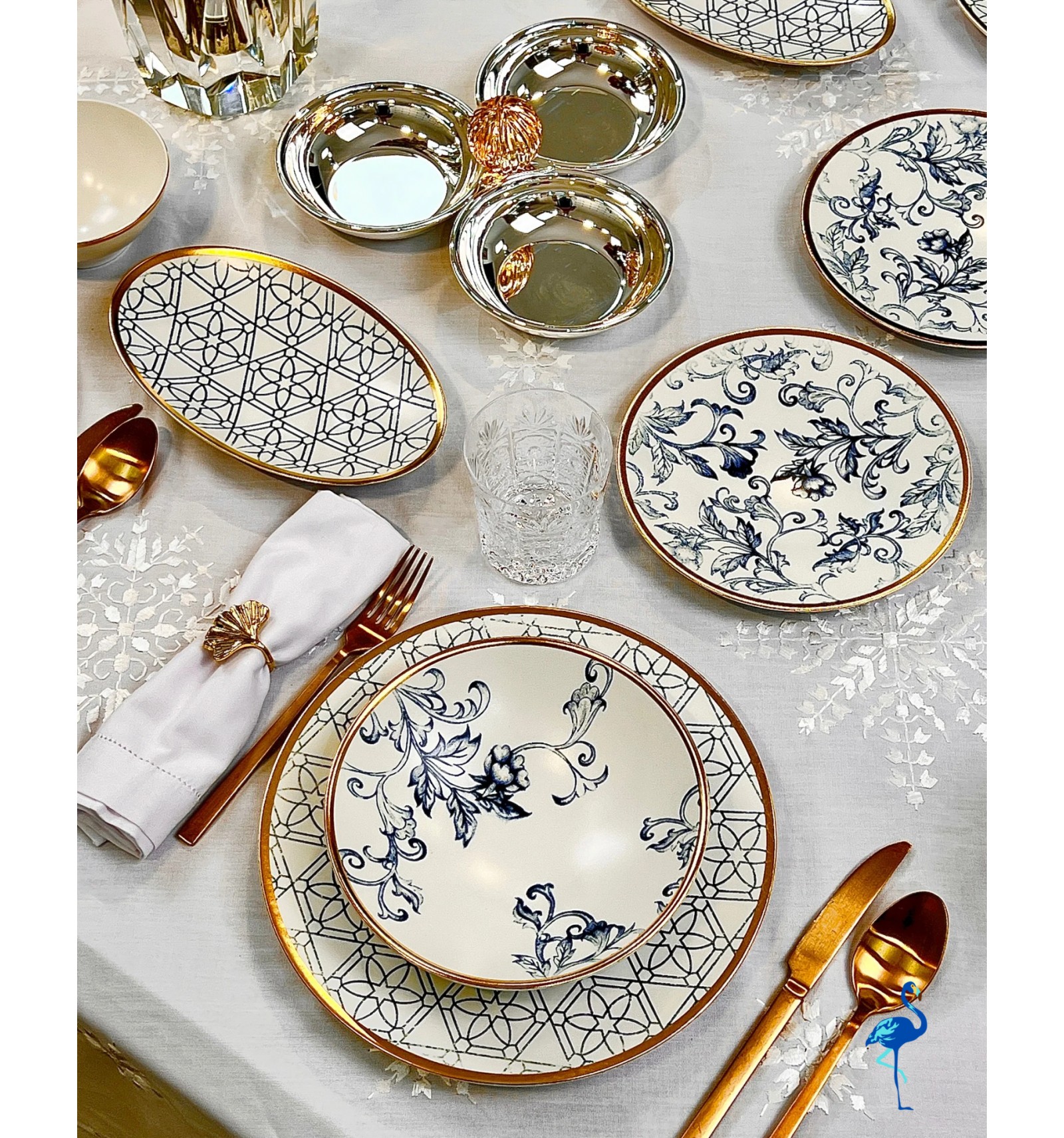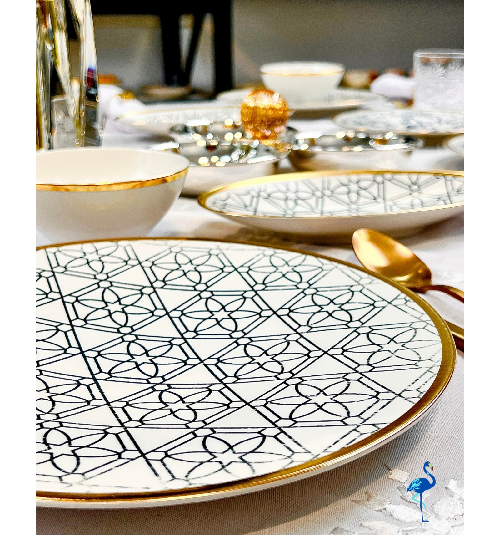 Chaque assiette est ornée de détails délicats et d’une bordure dorée brillante, pour un rendu chic et harmonieux.