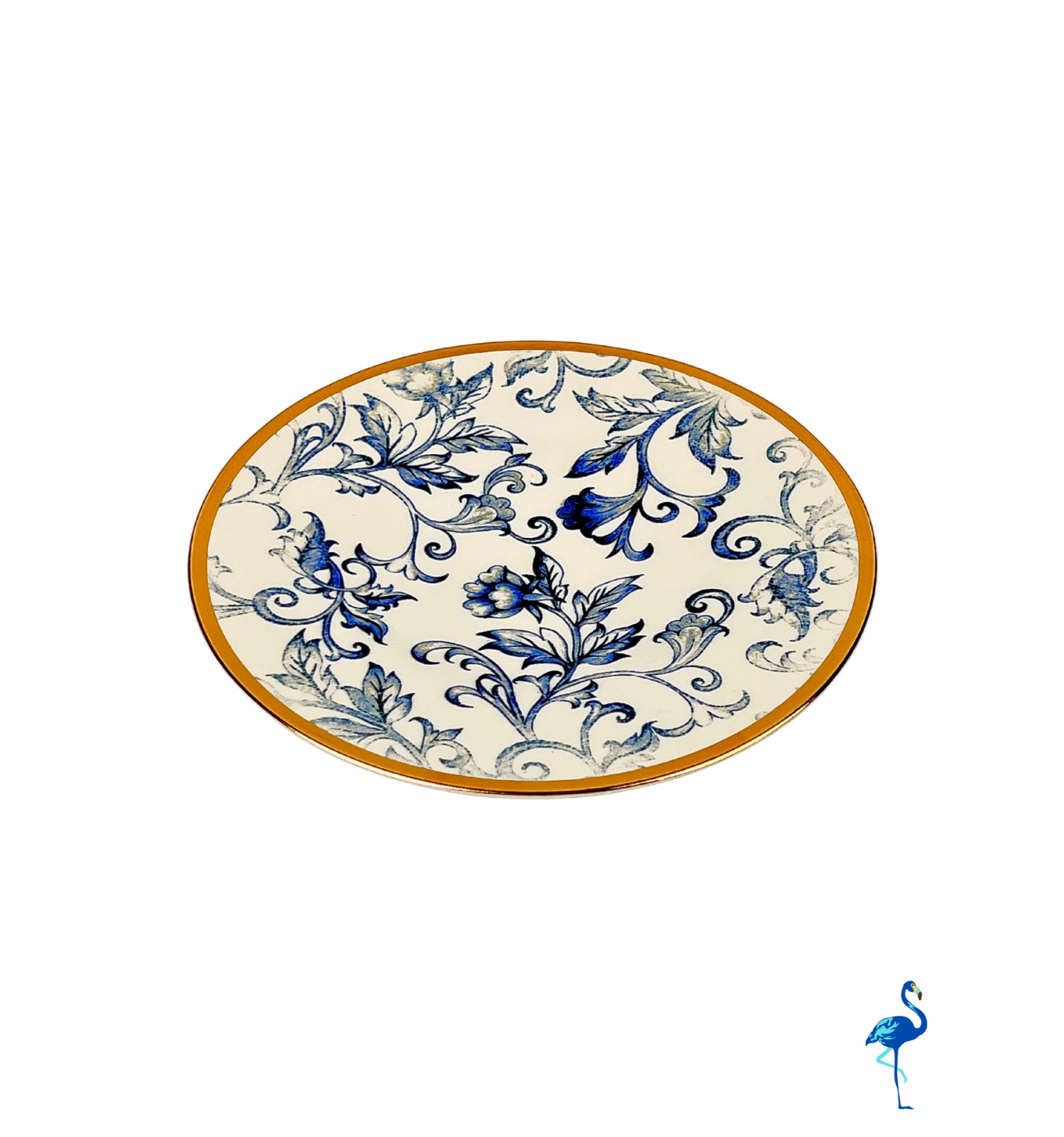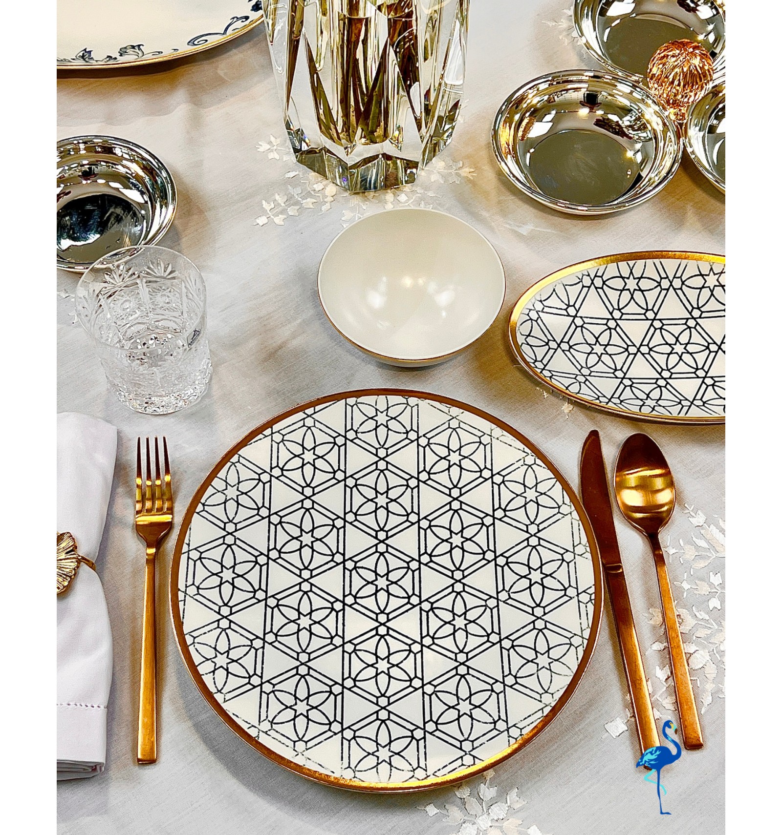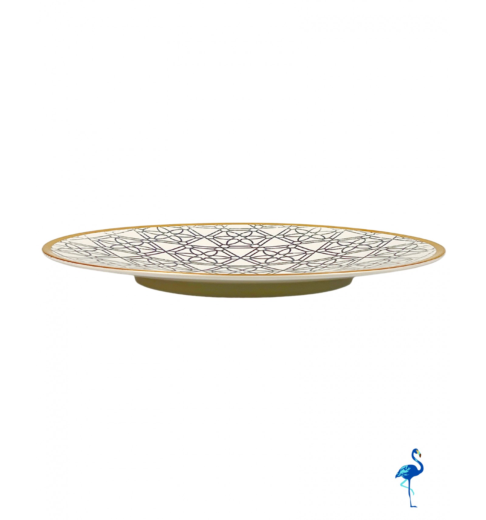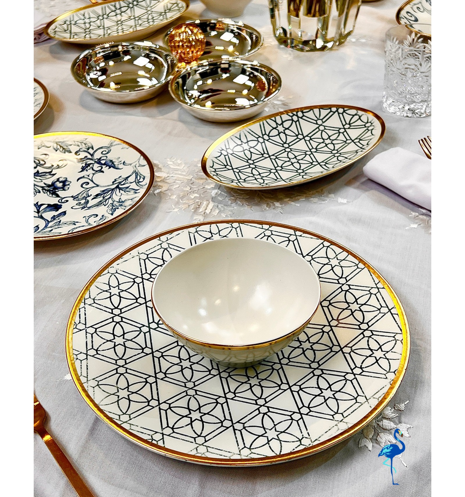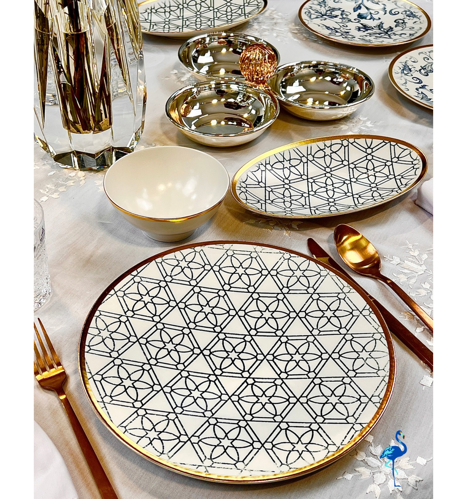 Chaque assiette est ornée de détails délicats et d’une bordure dorée brillante, pour un rendu chic et harmonieux.
