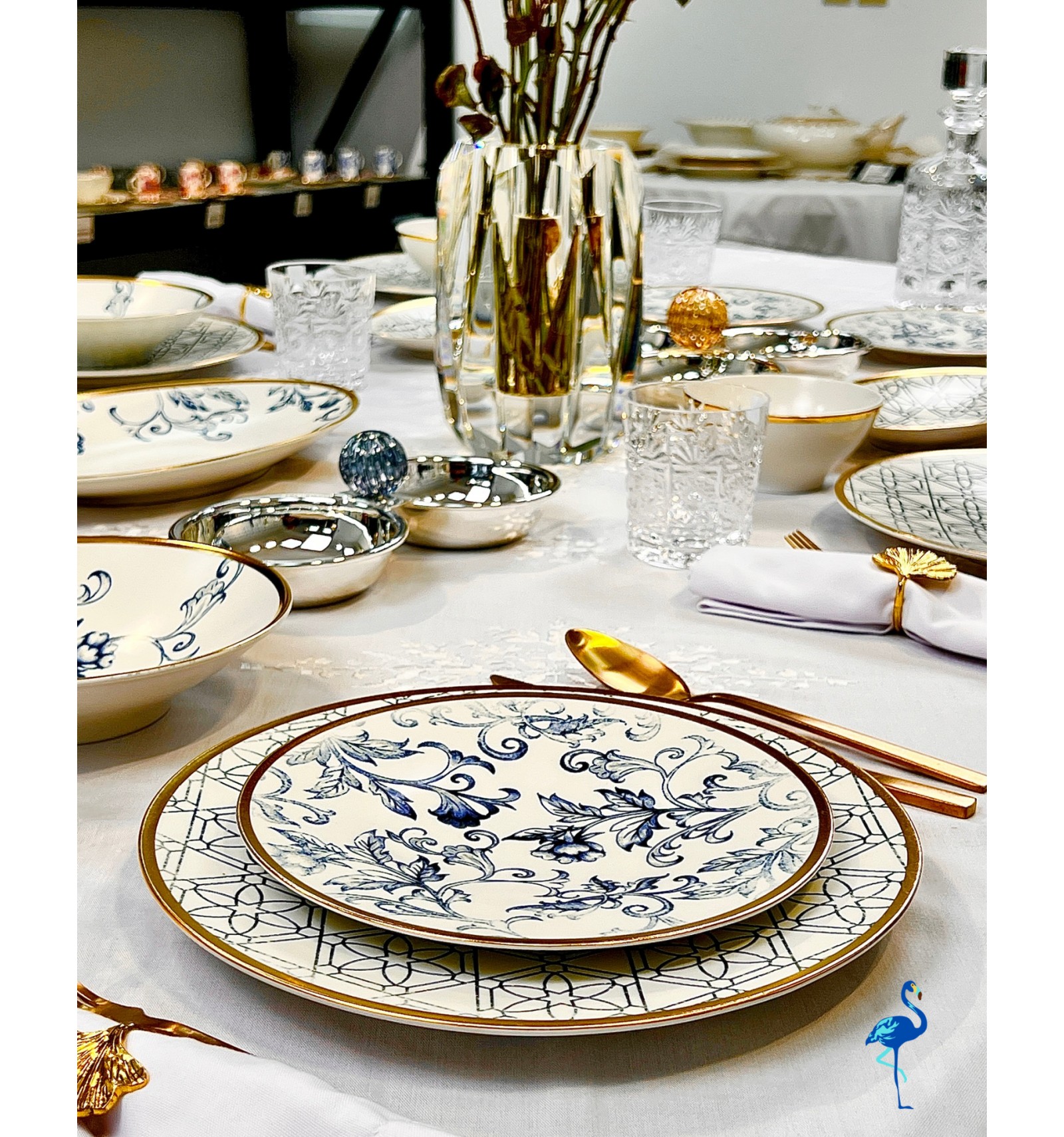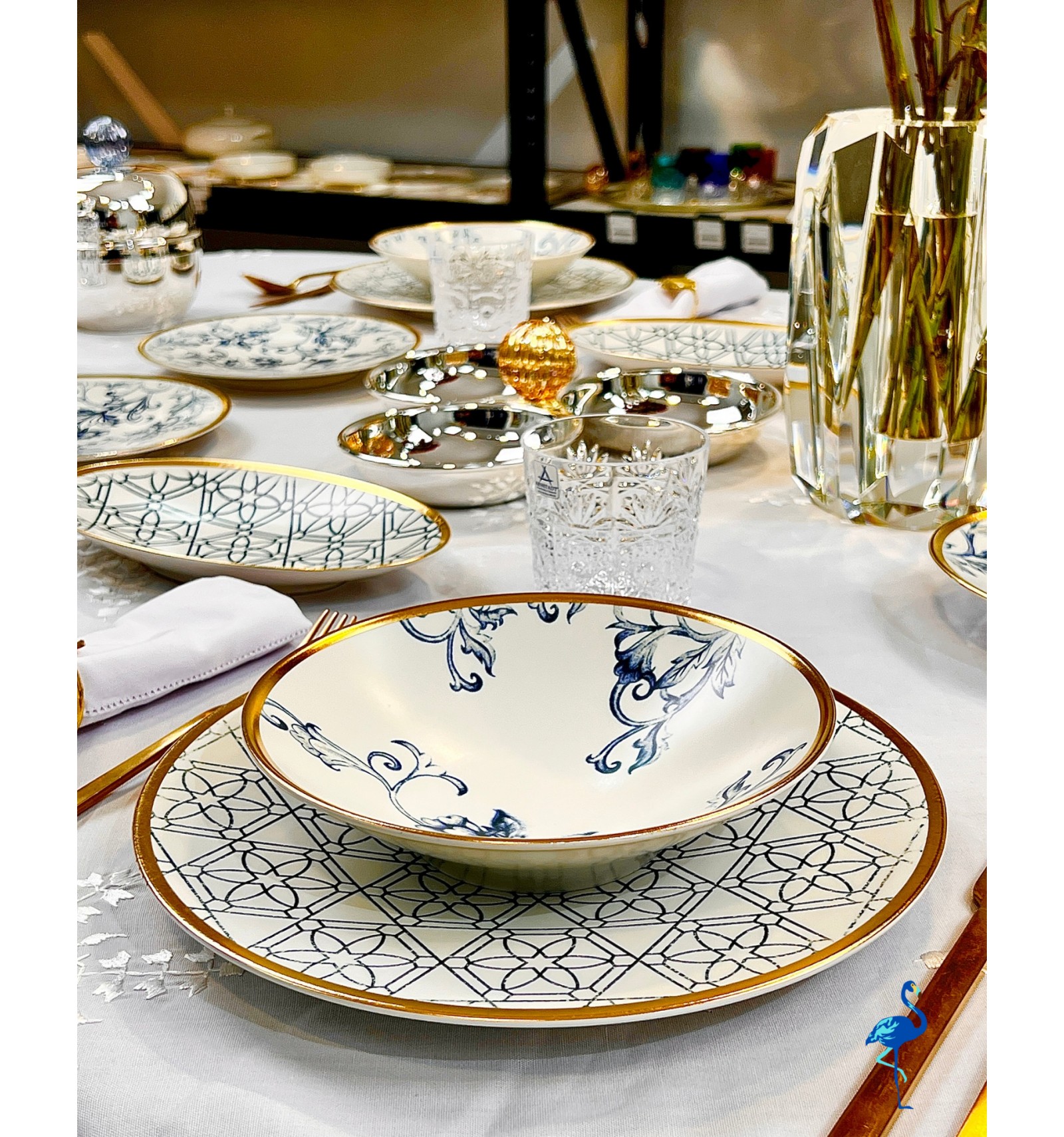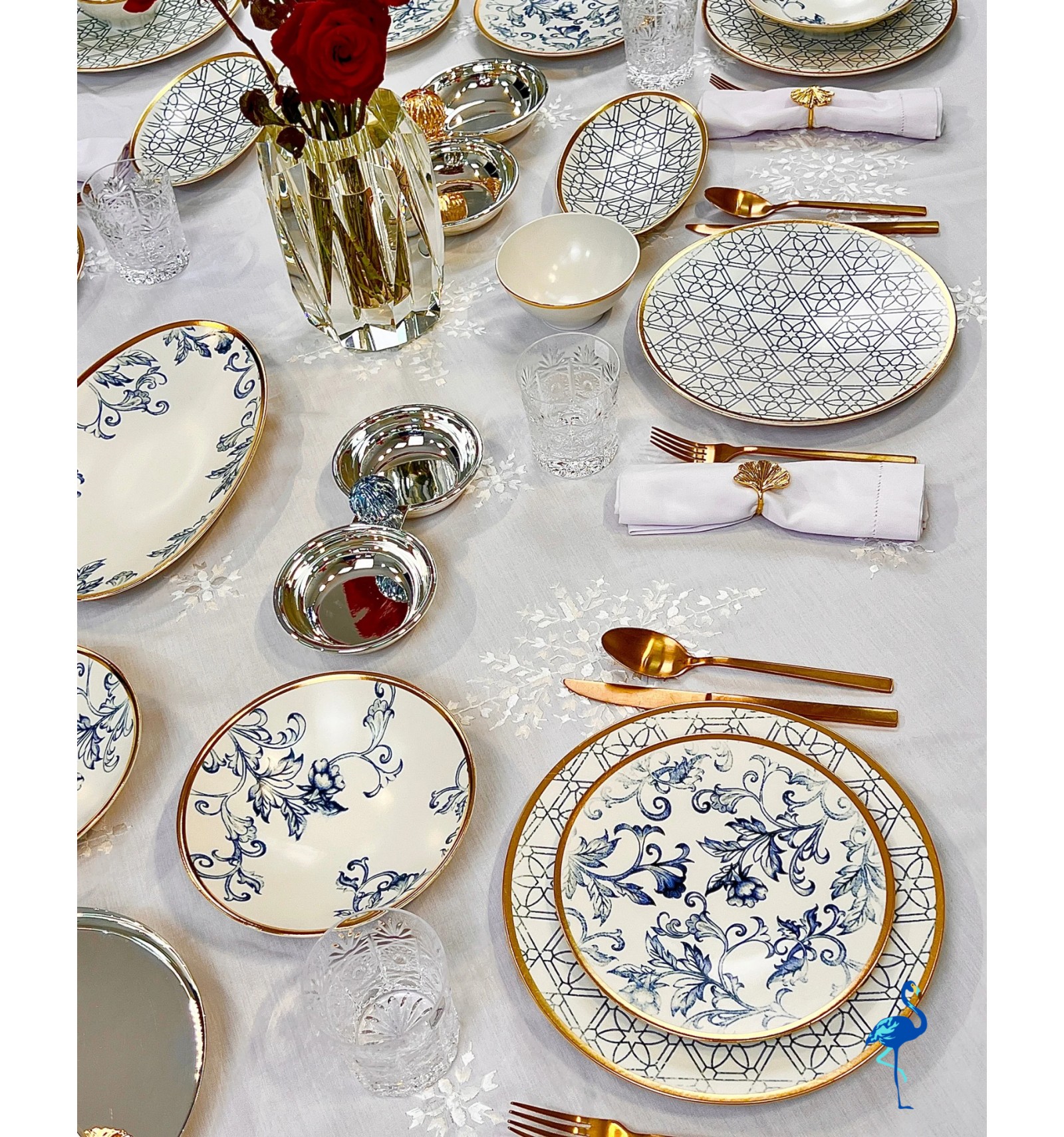 Le service de table Cynthia est un hommage à l’art et au savoir-faire marocain. Confectionné en porcelaine fine, il se distingue par ses motifs de zellige revisités dans des tons de bleu cobalt et doré, offrant un parfait équilibre entre tradition et modernité.