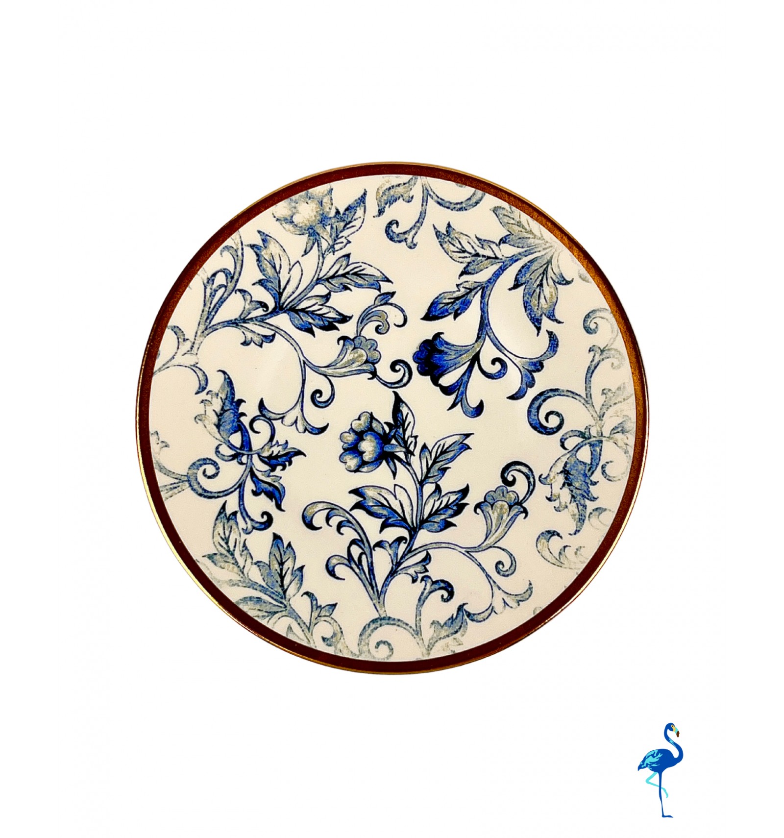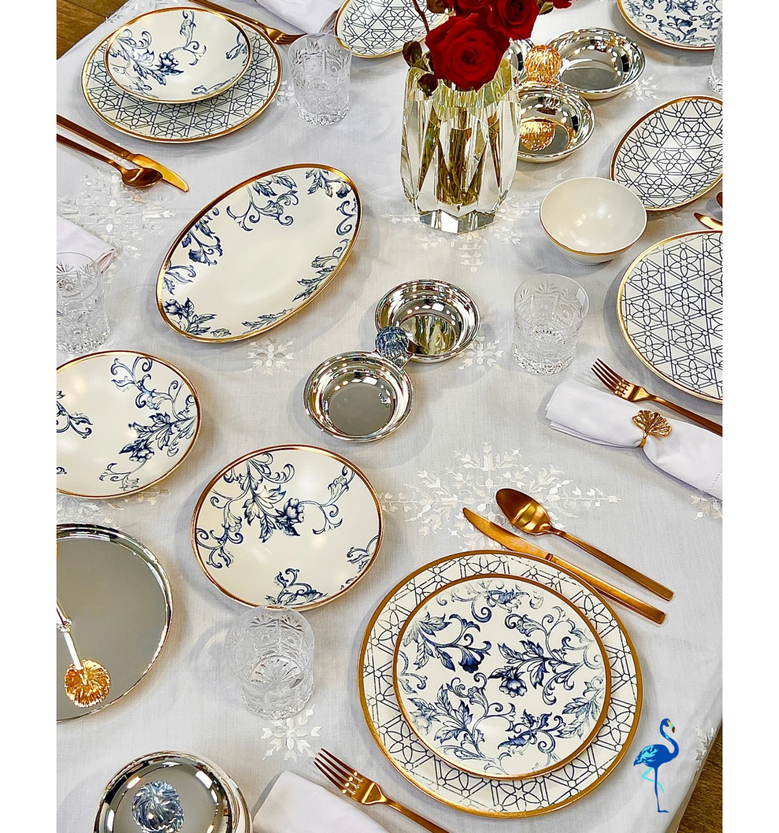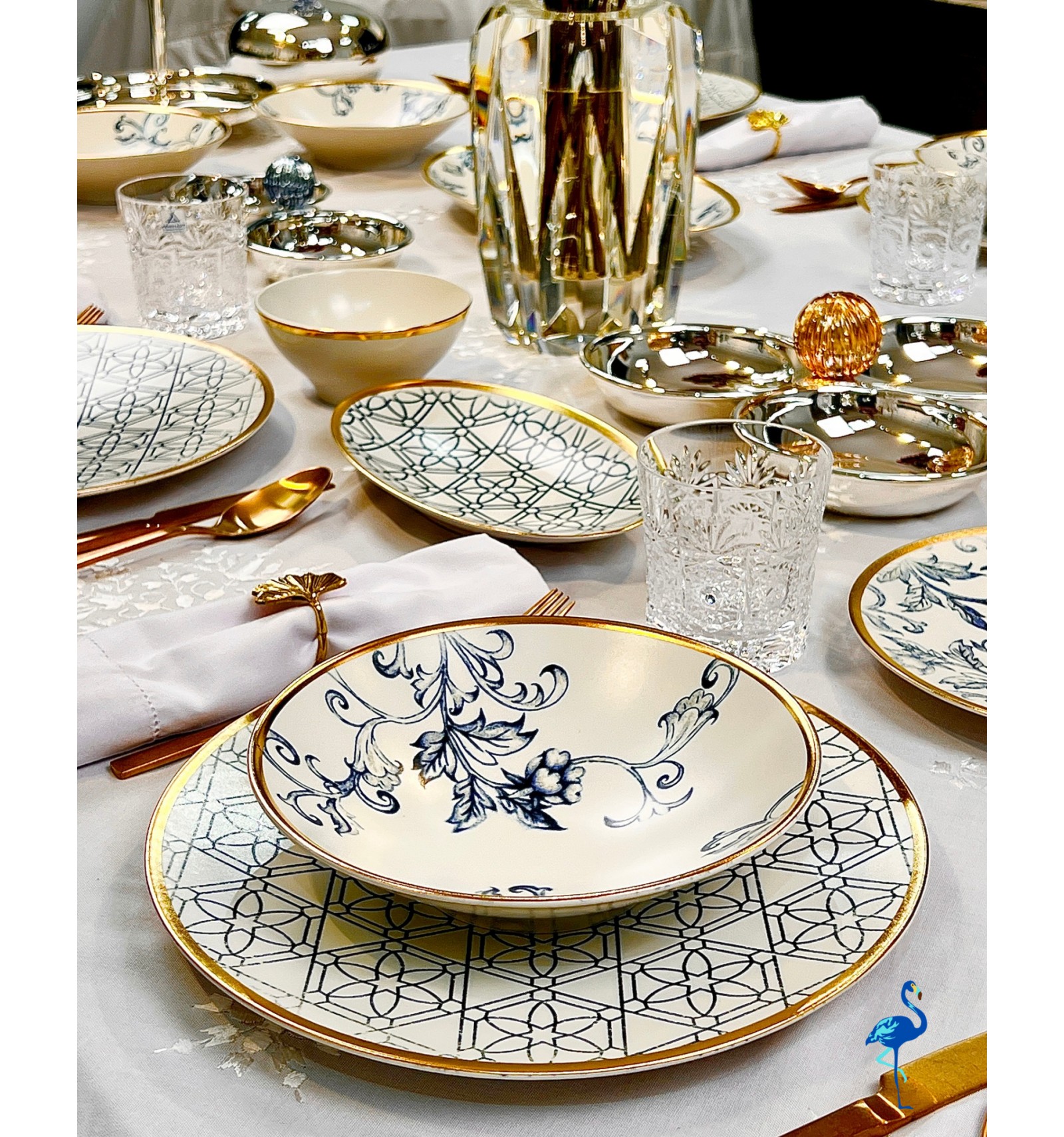 Le service de table Cynthia est un hommage à l’art et au savoir-faire marocain. Confectionné en porcelaine fine, il se distingue par ses motifs de zellige revisités dans des tons de bleu cobalt et doré, offrant un parfait équilibre entre tradition et modernité.