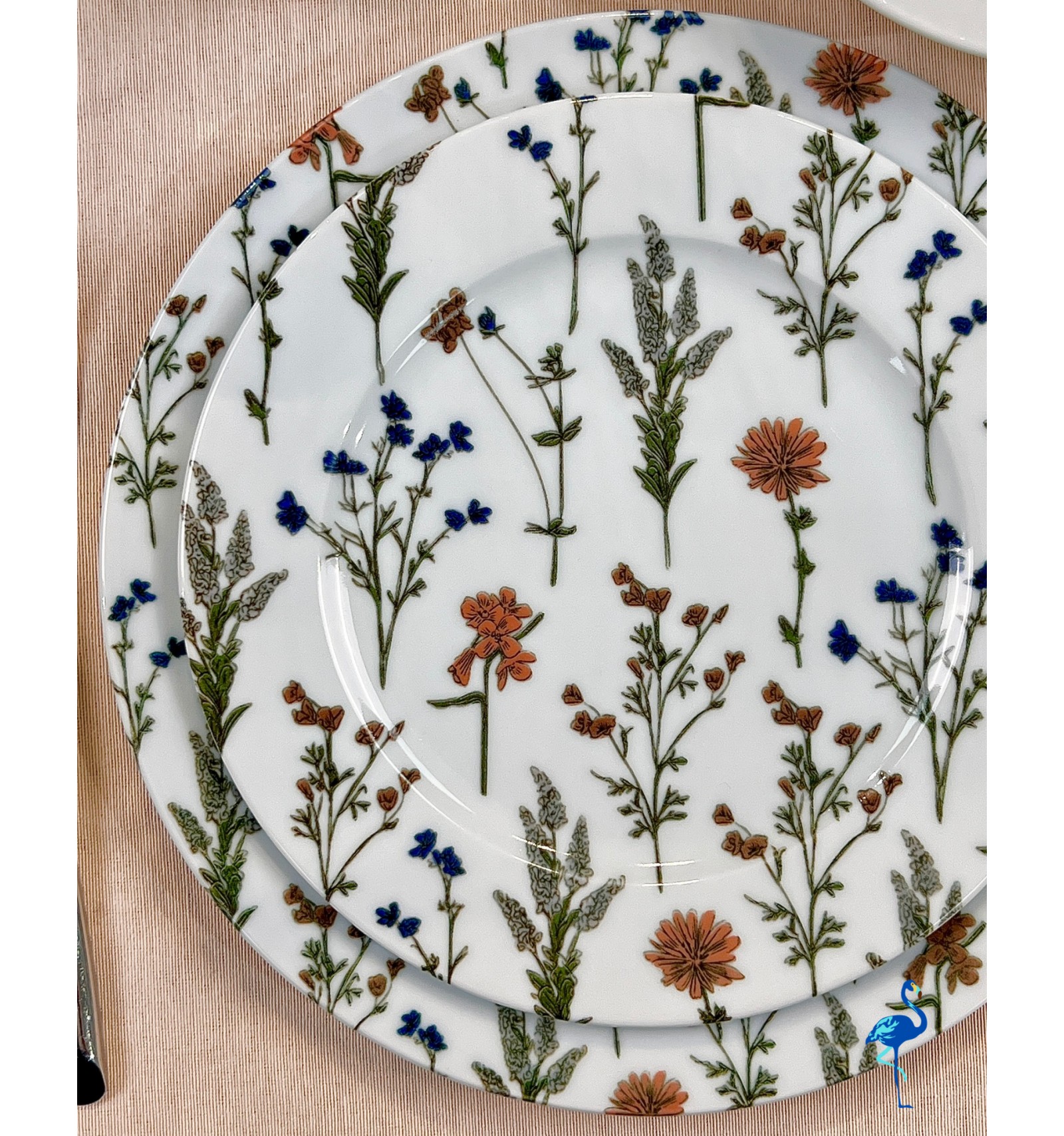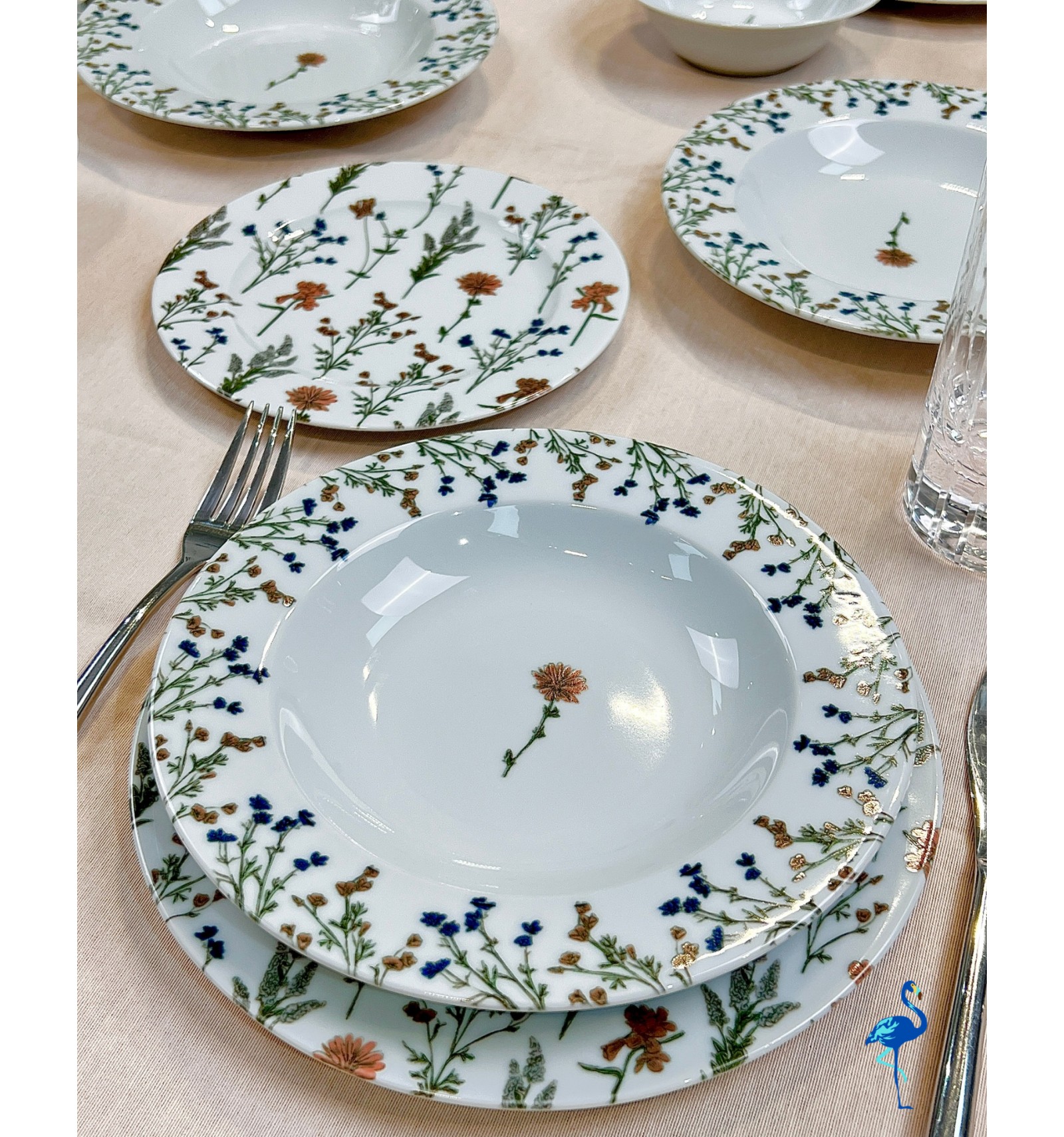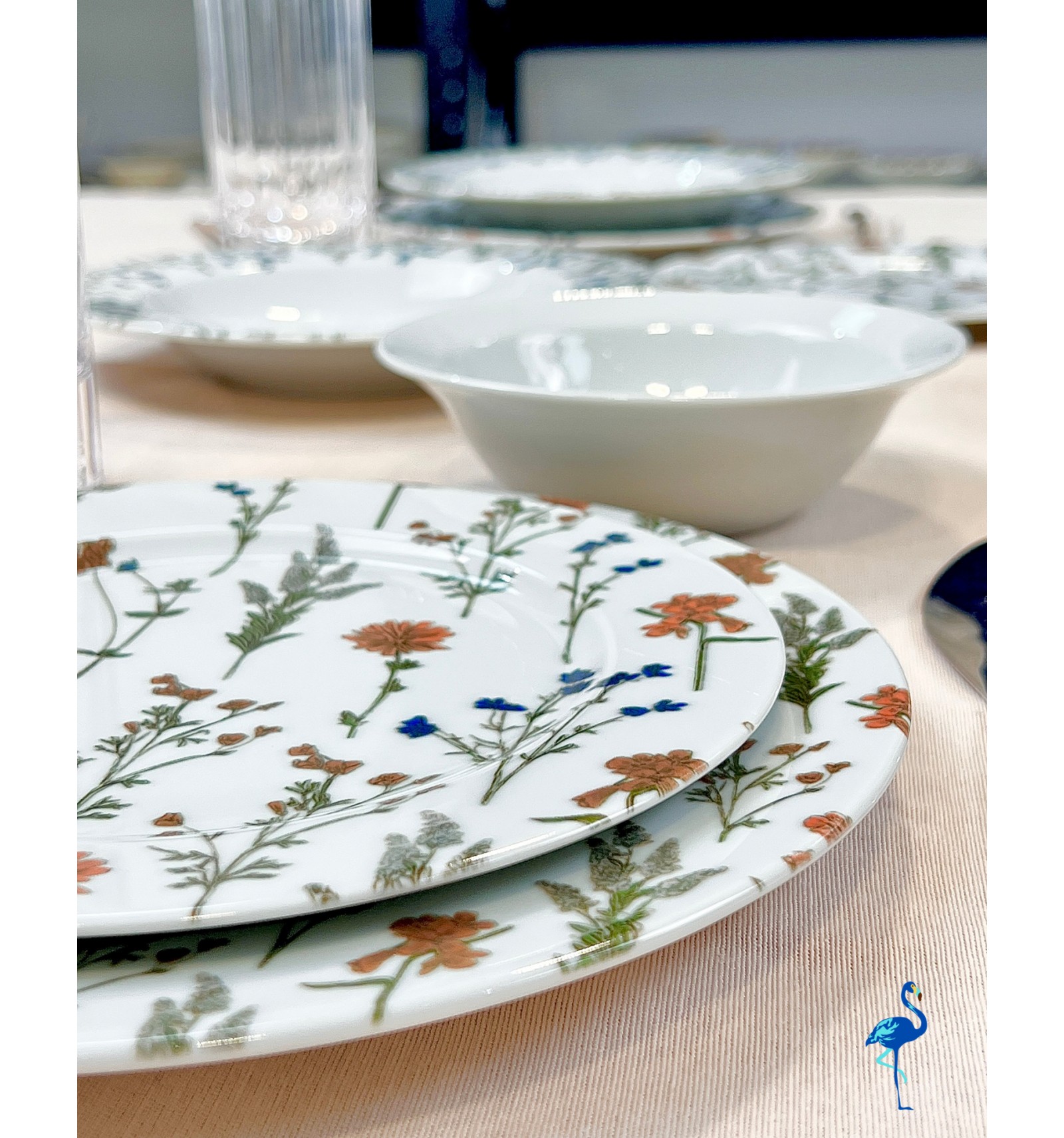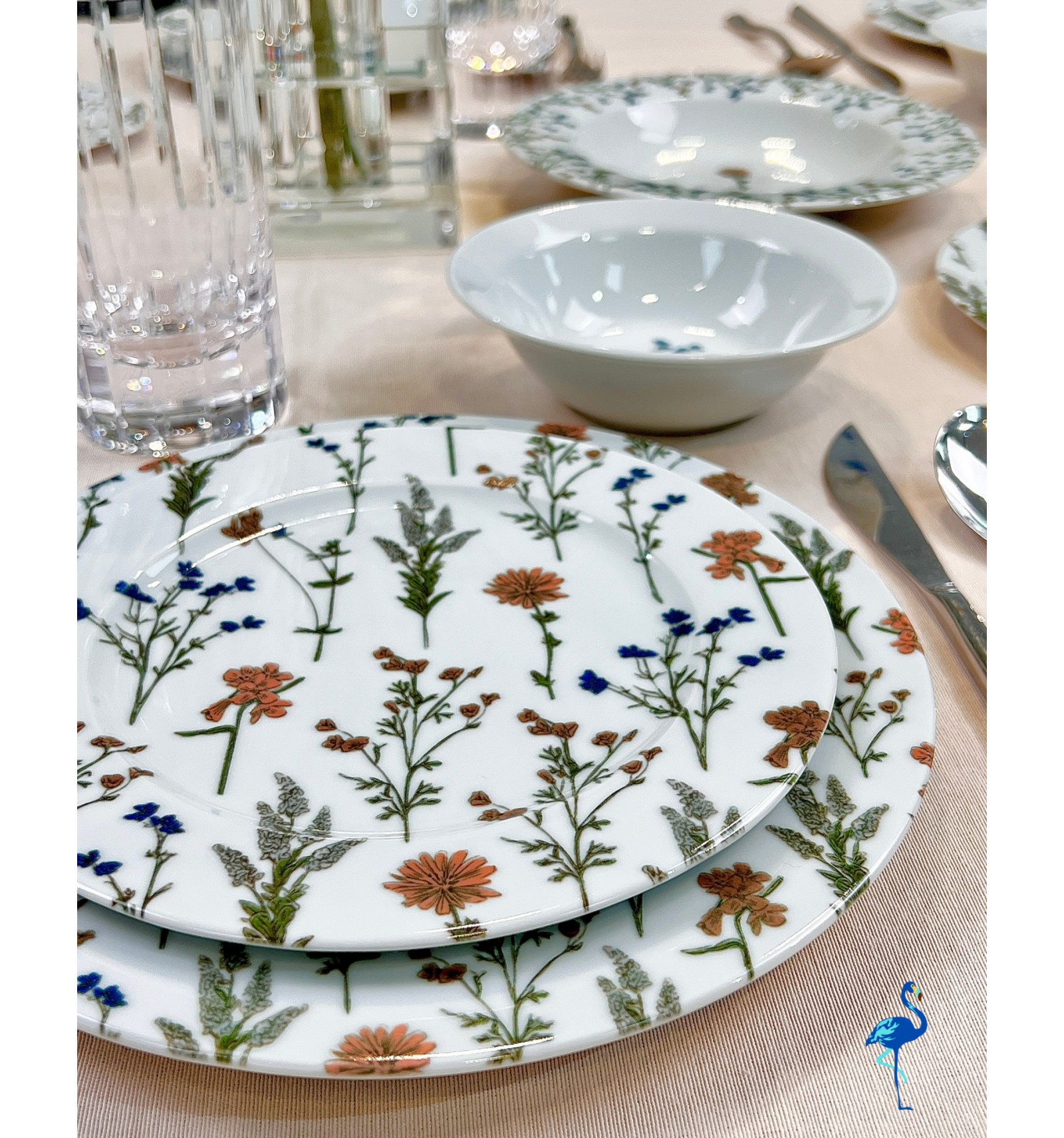 Le service de table Paola transforme chaque repas en un moment de douceur et d’élégance. Réalisé en porcelaine fine de haute qualité, il se distingue par ses motifs de fleurs sauvages dans des tons de bleu, orange et vert, évoquant la beauté naturelle d’un jardin en fleurs.