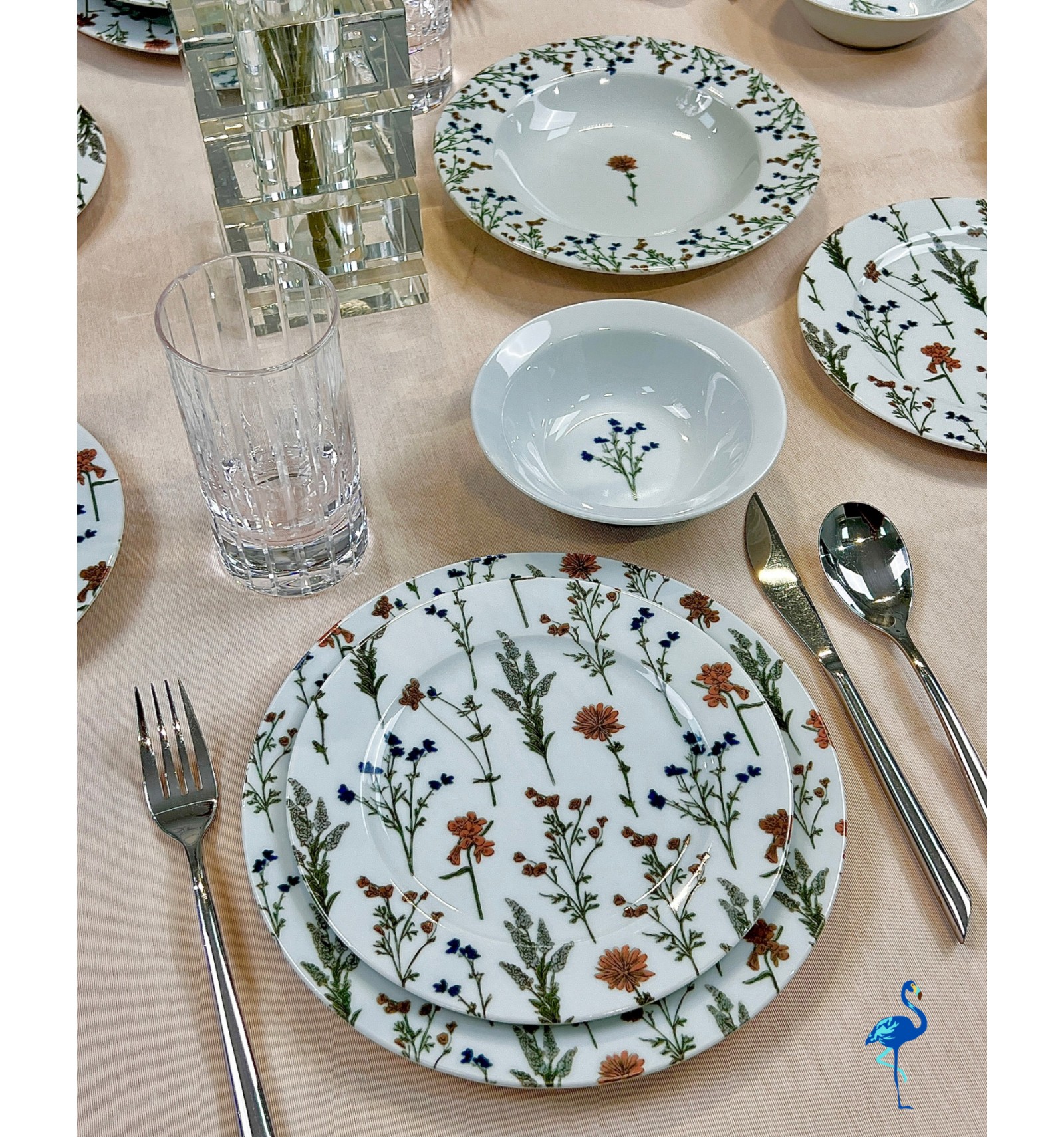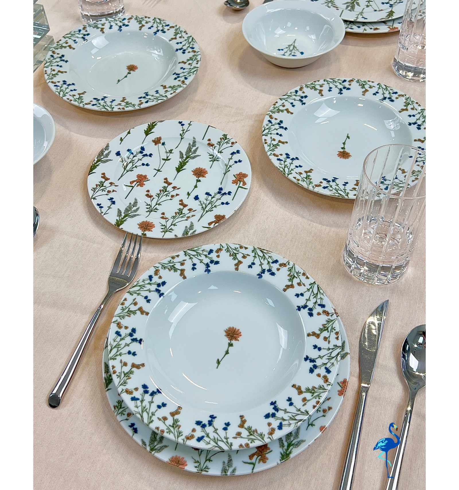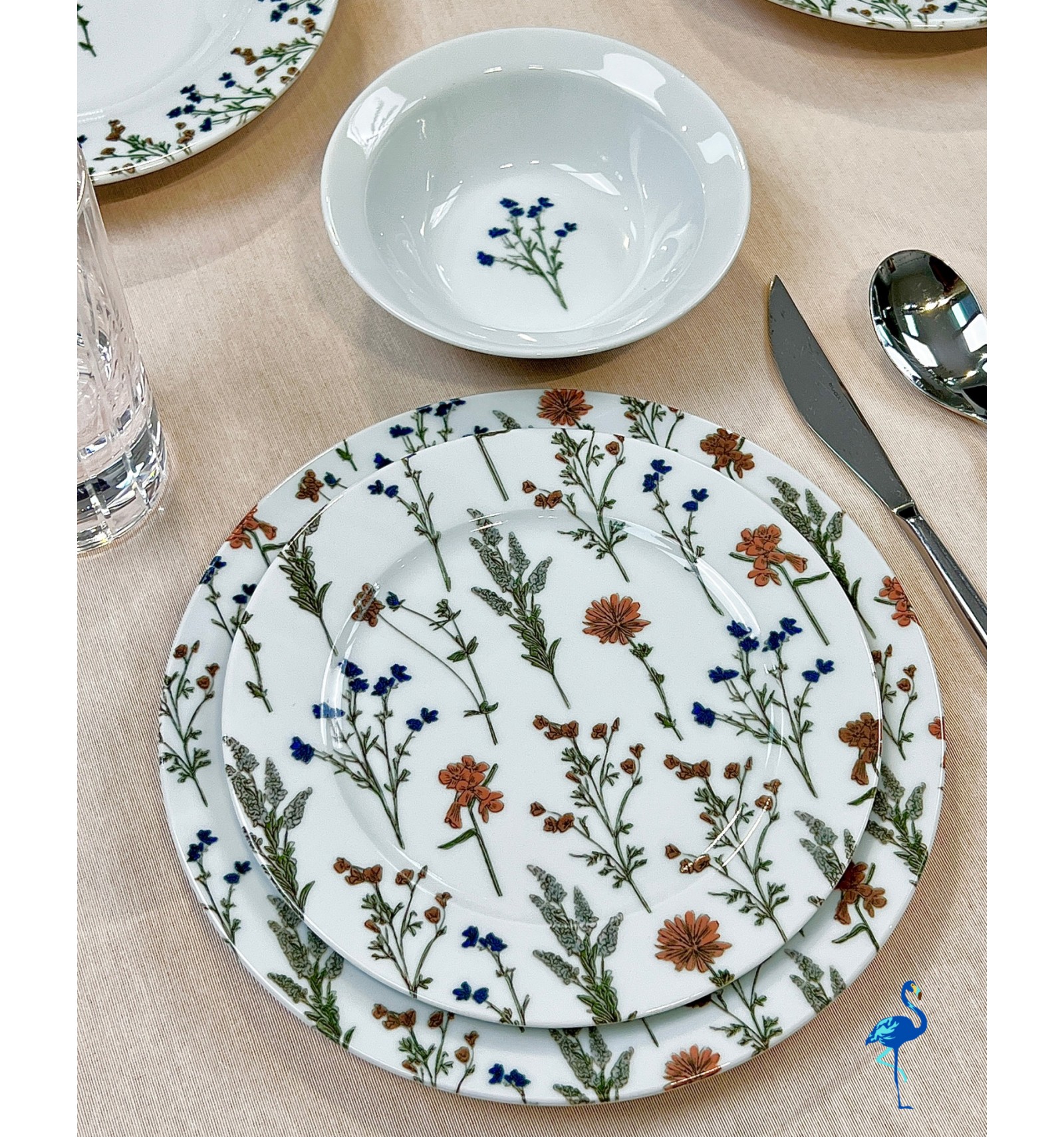 Le service de table Paola transforme chaque repas en un moment de douceur et d’élégance. Réalisé en porcelaine fine de haute qualité, il se distingue par ses motifs de fleurs sauvages dans des tons de bleu, orange et vert, évoquant la beauté naturelle d’un jardin en fleurs.
