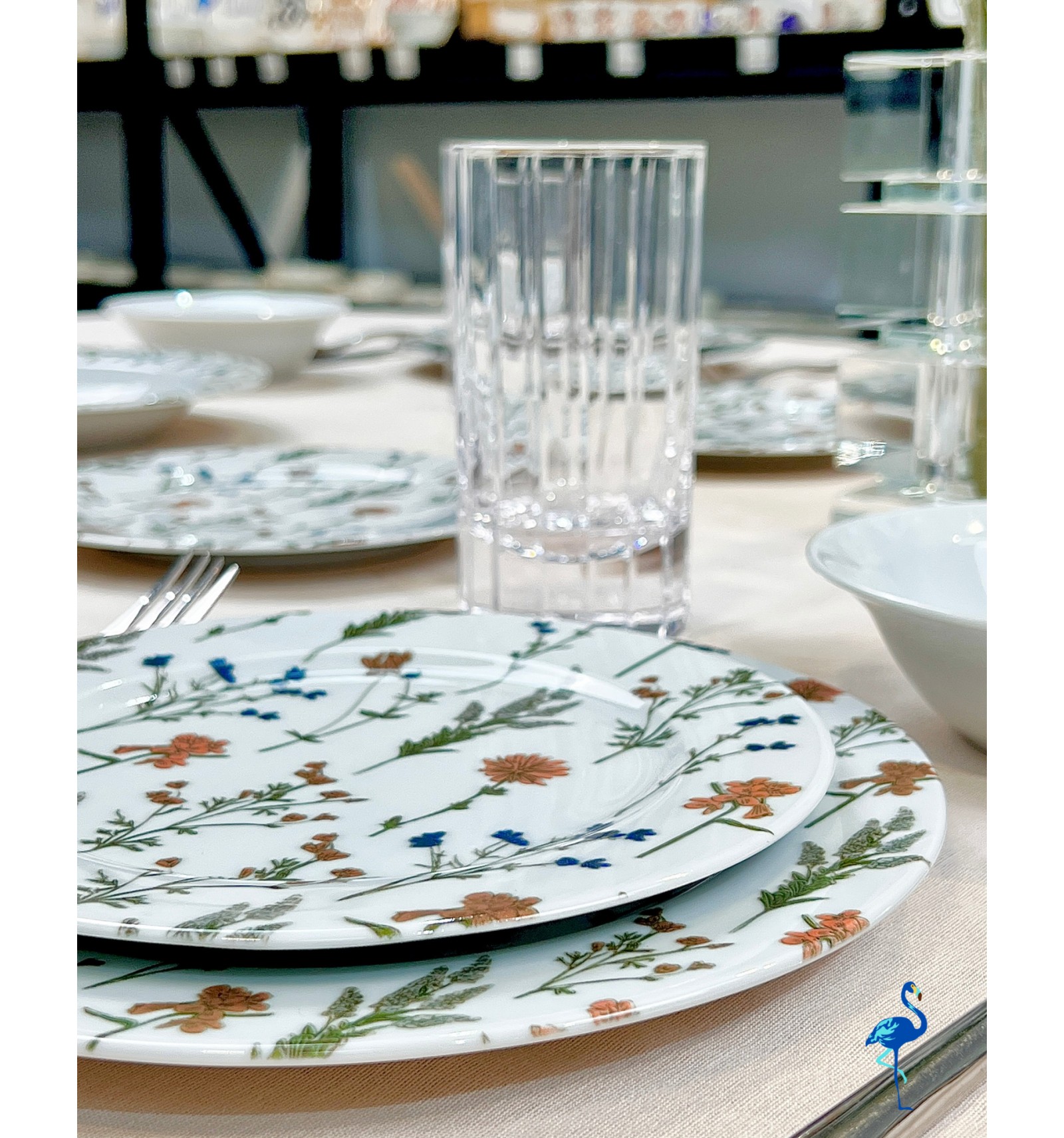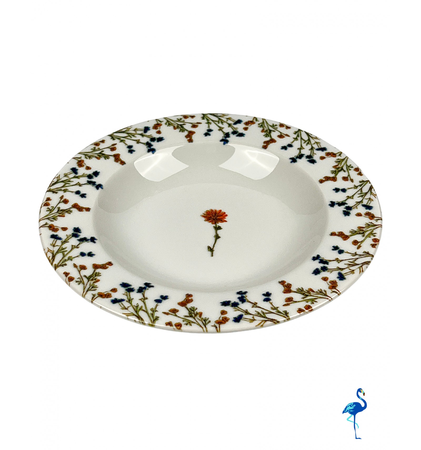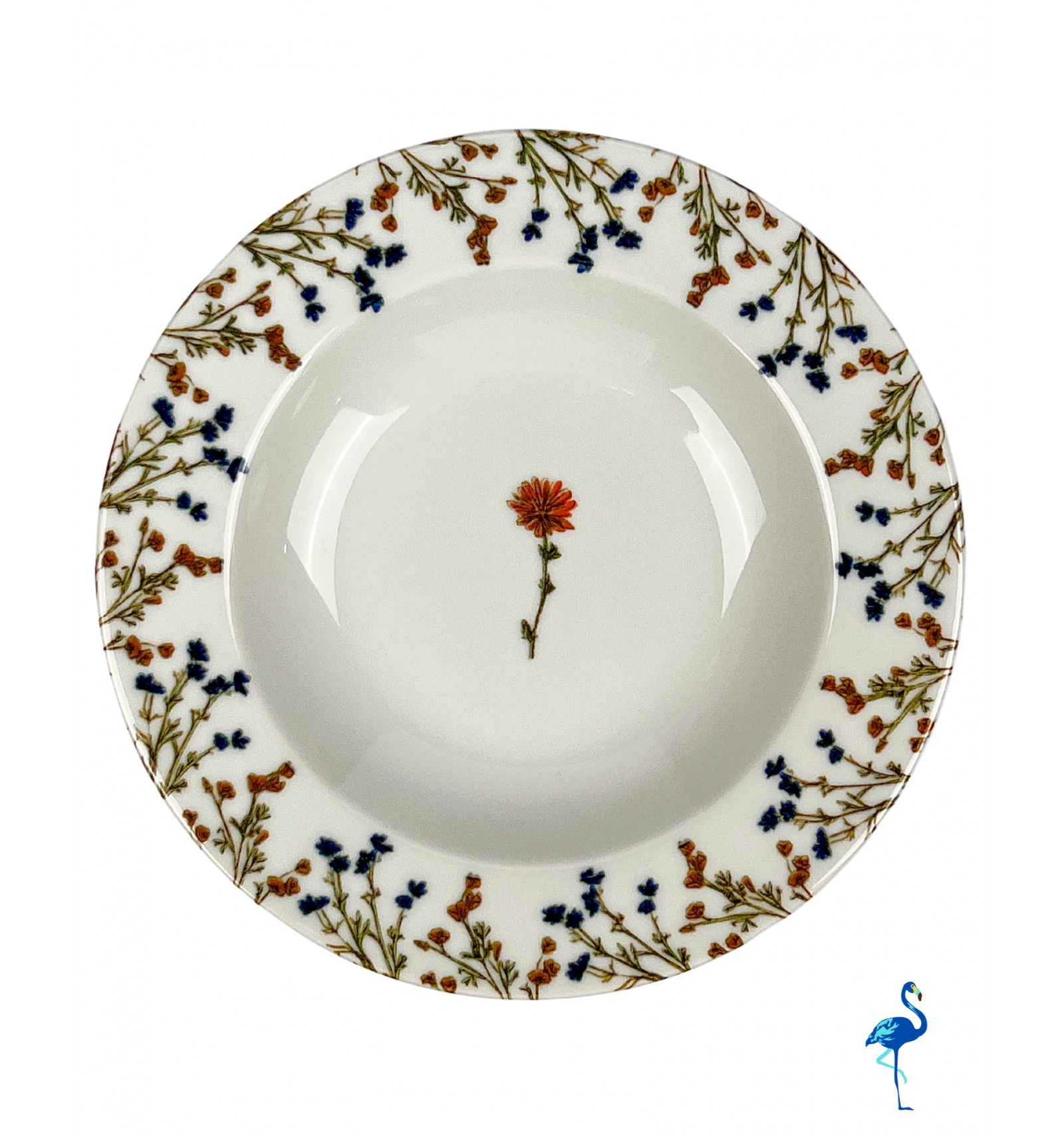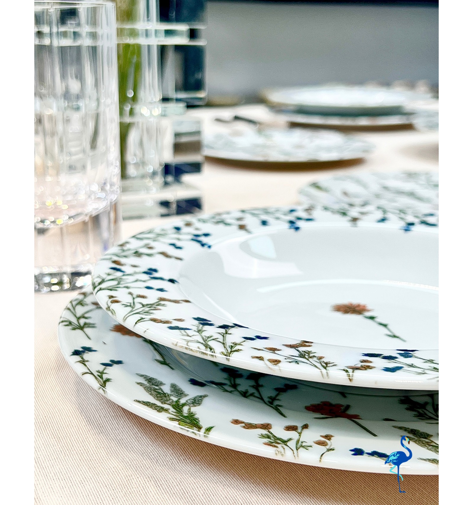 Le service de table Paola transforme chaque repas en un moment de douceur et d’élégance. Réalisé en porcelaine fine de haute qualité, il se distingue par ses motifs de fleurs sauvages dans des tons de bleu, orange et vert, évoquant la beauté naturelle d’un jardin en fleurs.