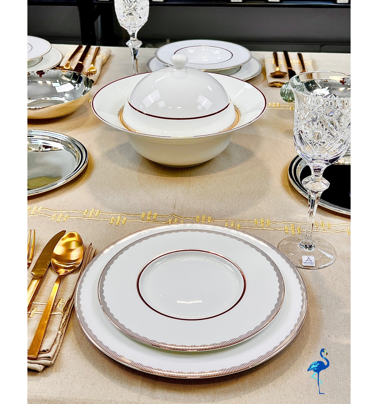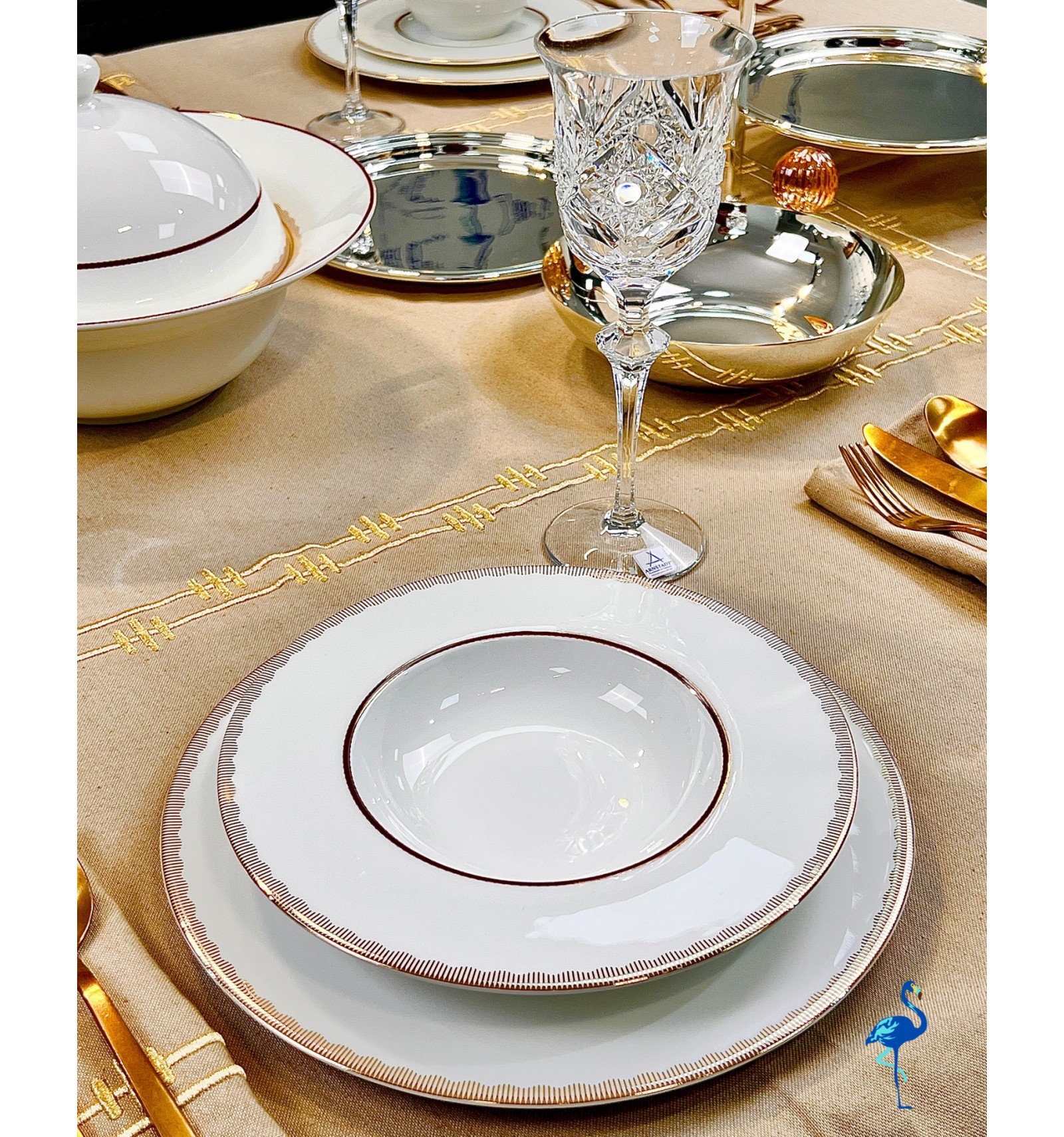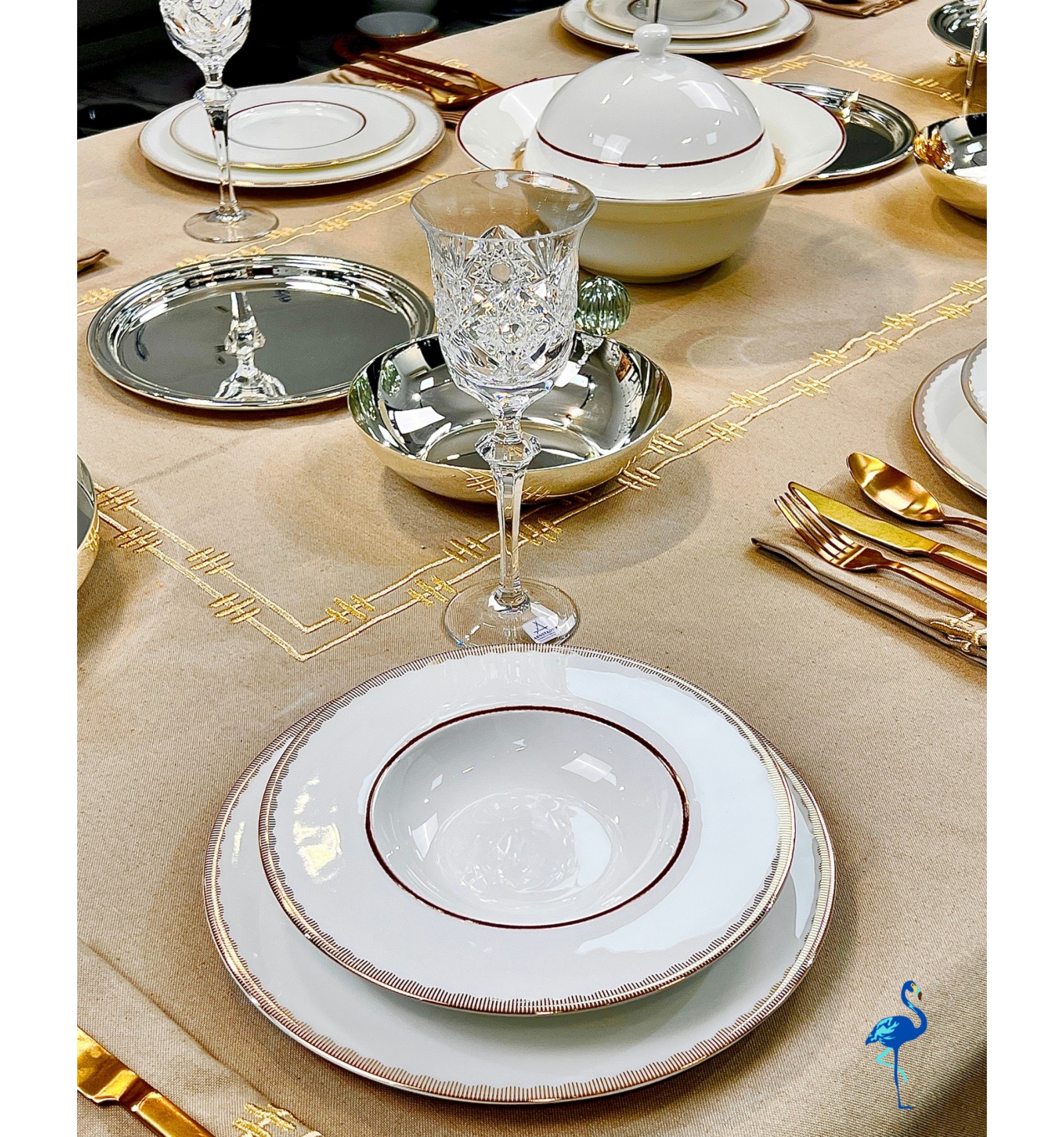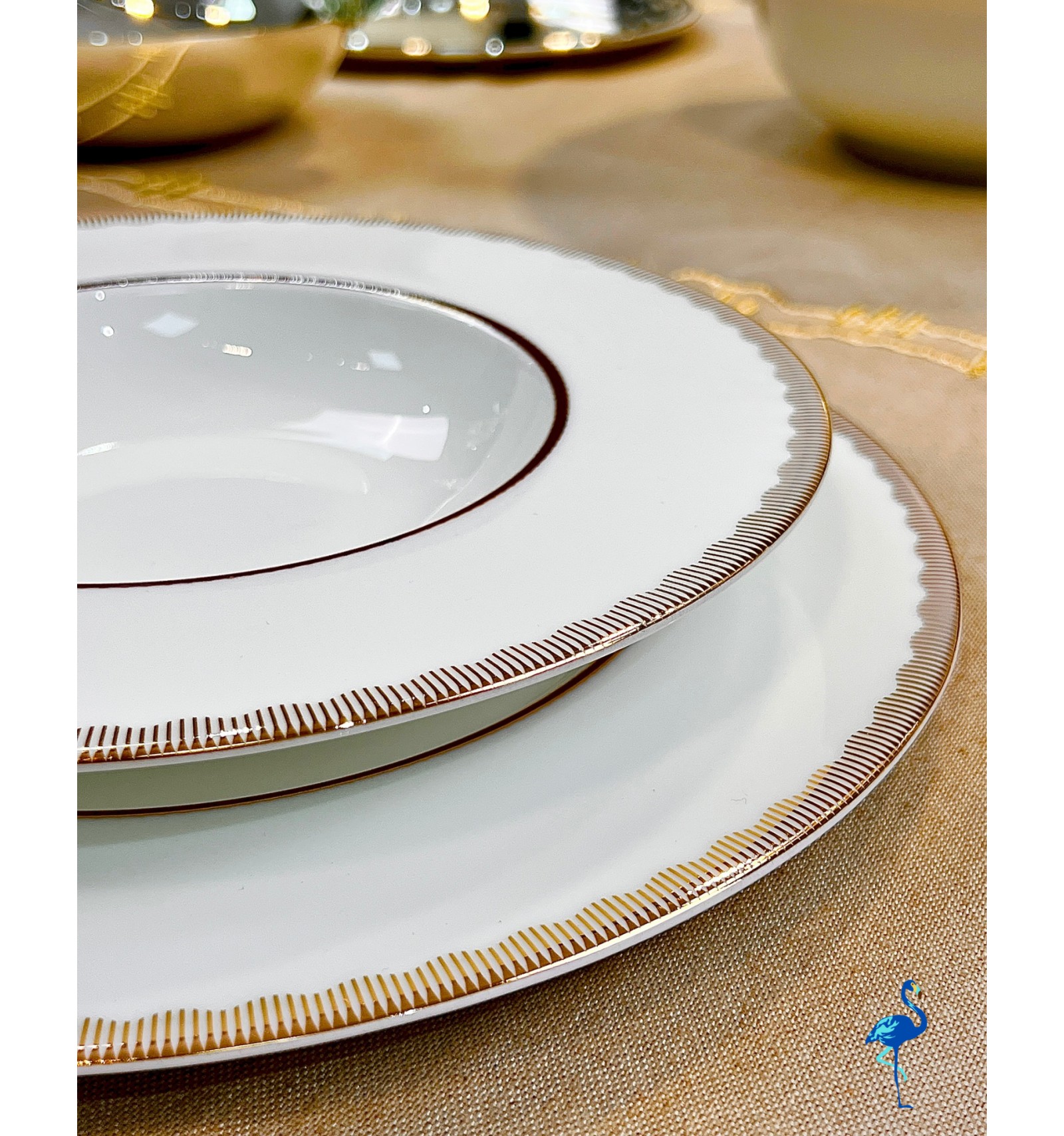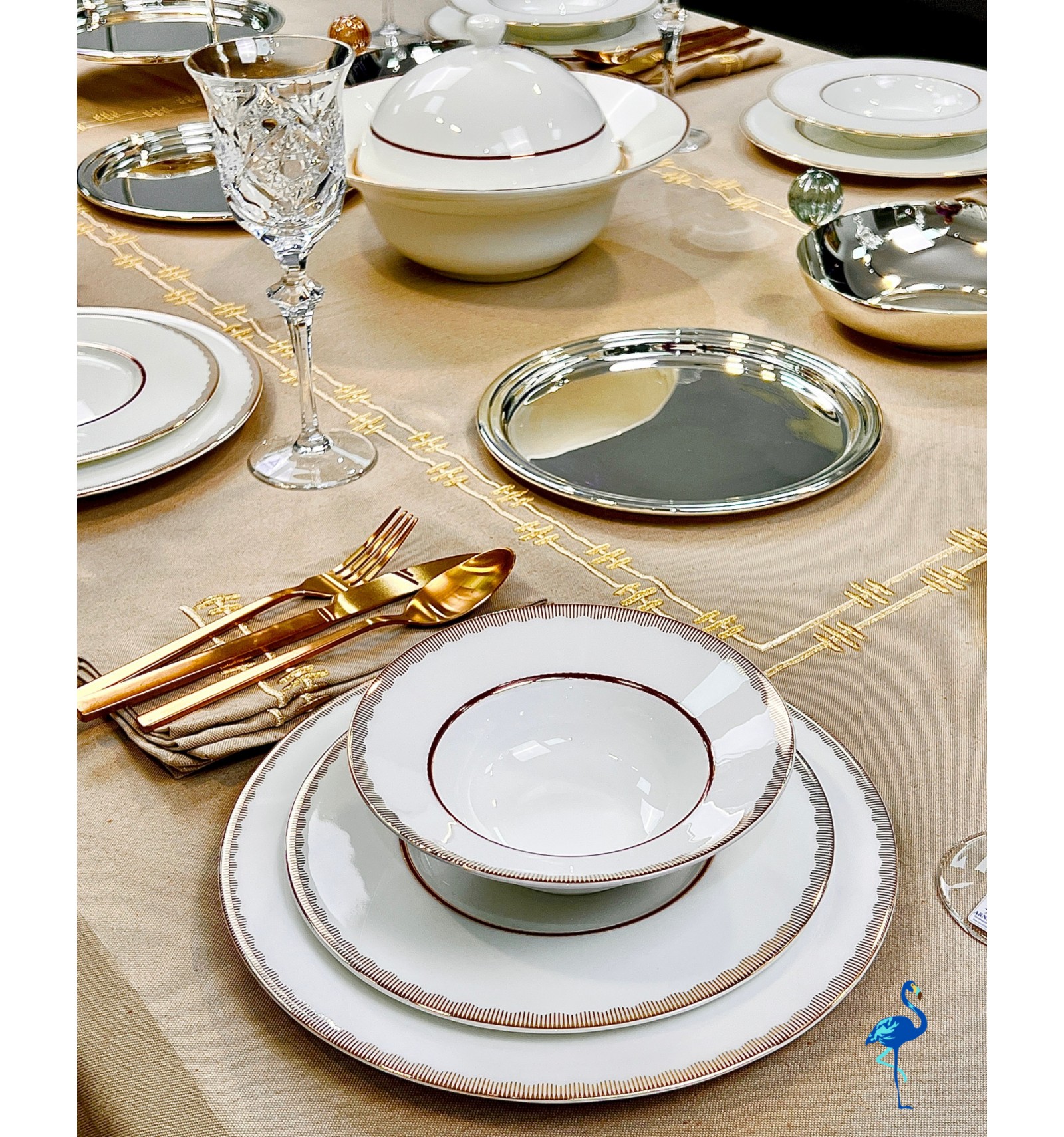Chaque pièce révèle une finition d’une grande finesse, inspirée de l’art de la table européen, tout en s’intégrant parfaitement dans un décor moderne. Associé à des verres en cristal et des couverts dorés, il crée une atmosphère chaleureuse et distinguée, digne des plus belles tables de réception.