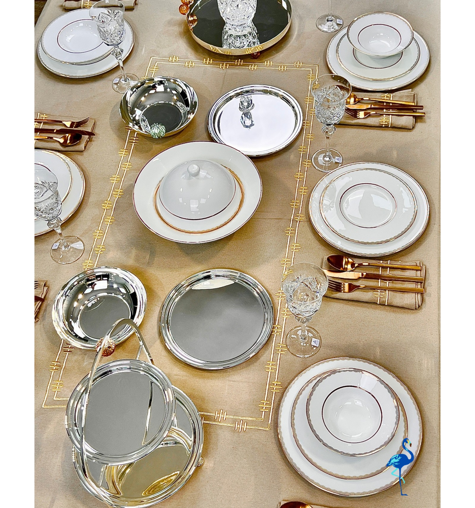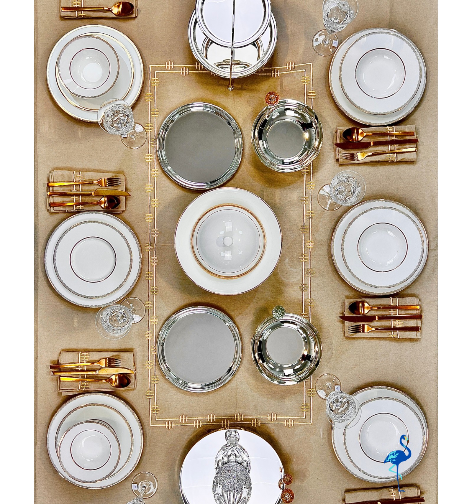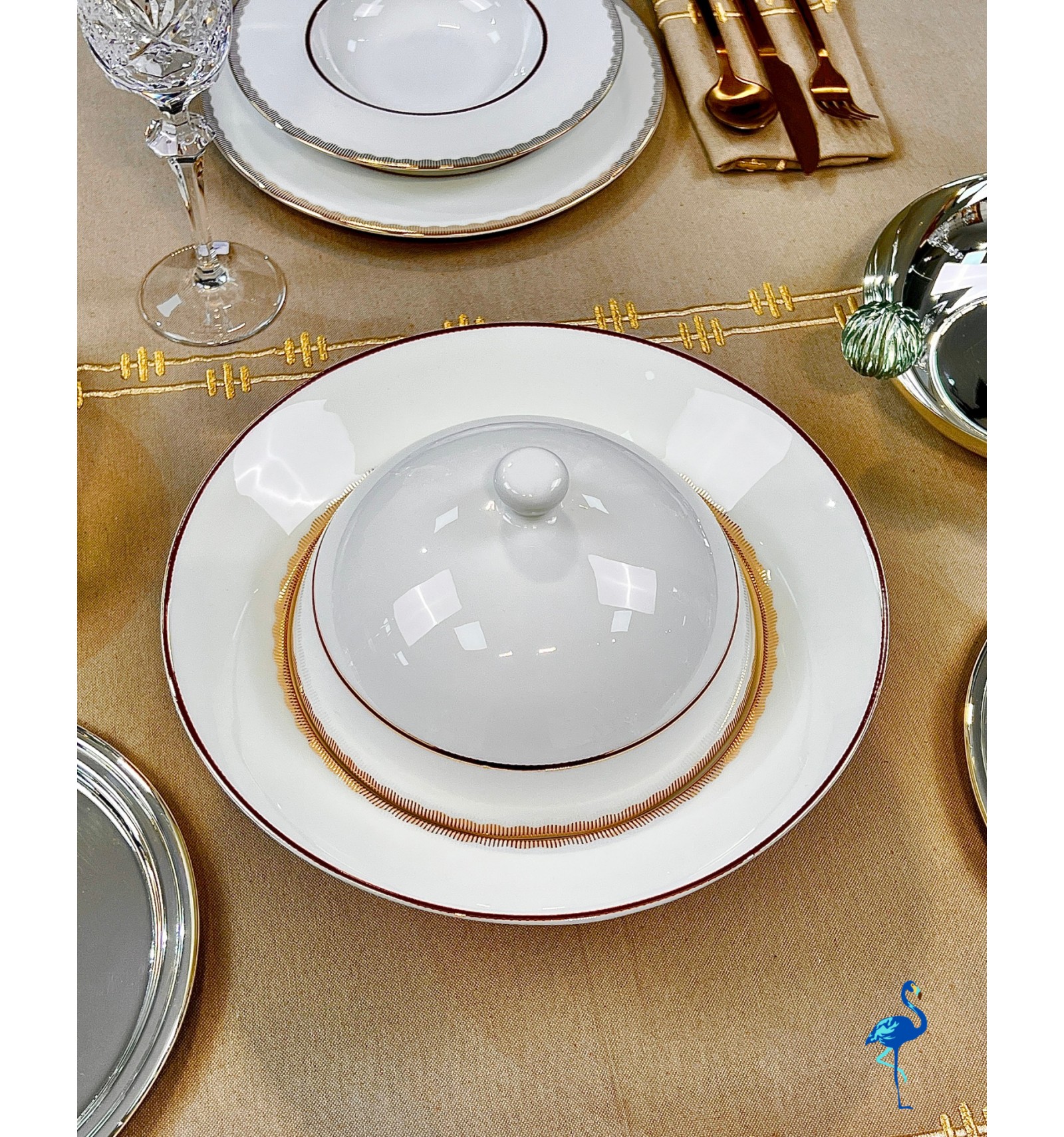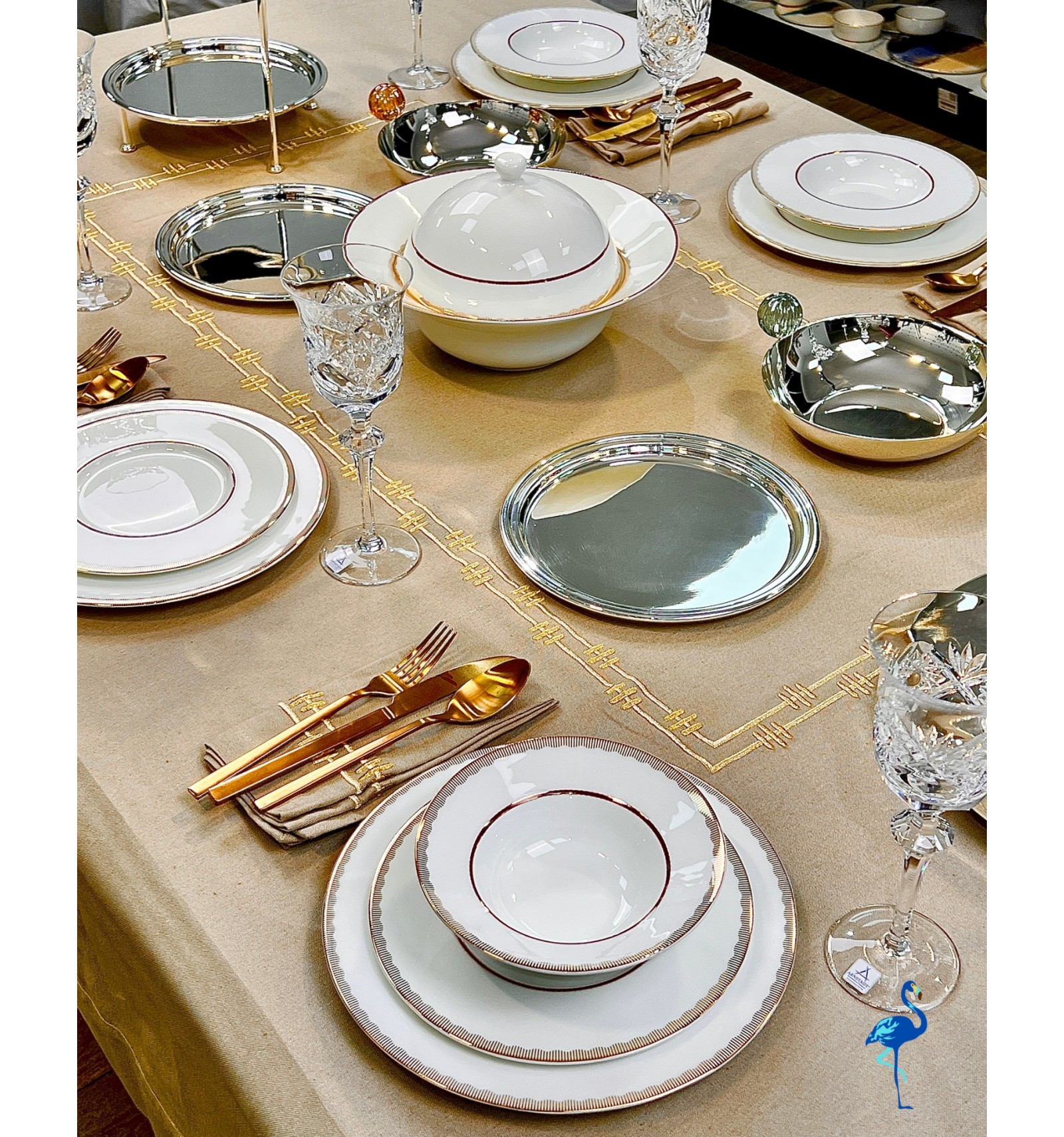 Chaque pièce révèle une finition d’une grande finesse, inspirée de l’art de la table européen, tout en s’intégrant parfaitement dans un décor moderne. Associé à des verres en cristal et des couverts dorés, il crée une atmosphère chaleureuse et distinguée, digne des plus belles tables de réception.