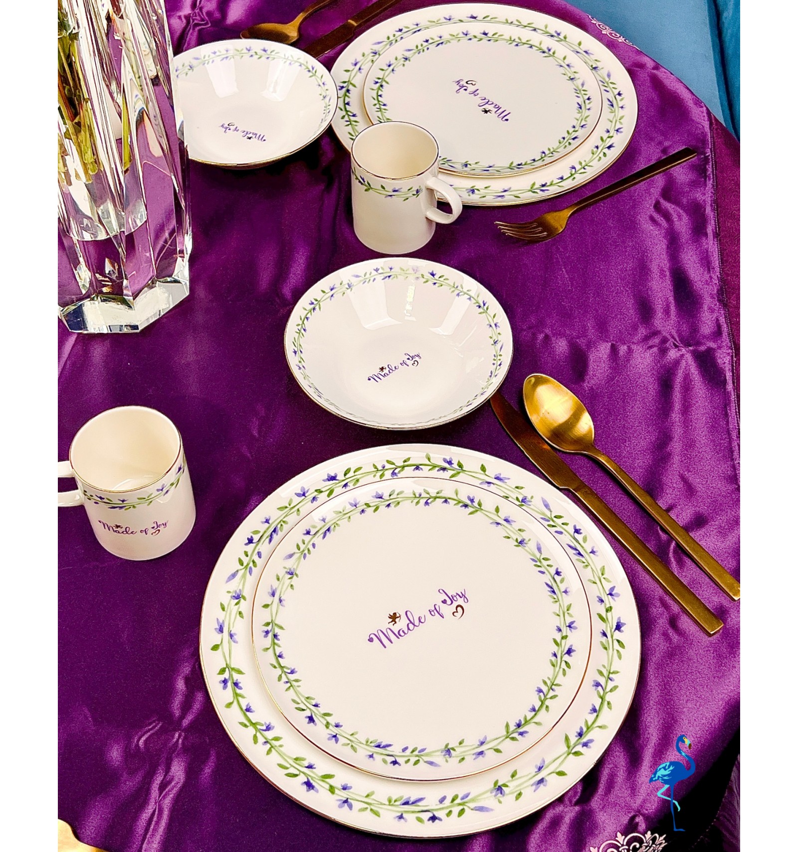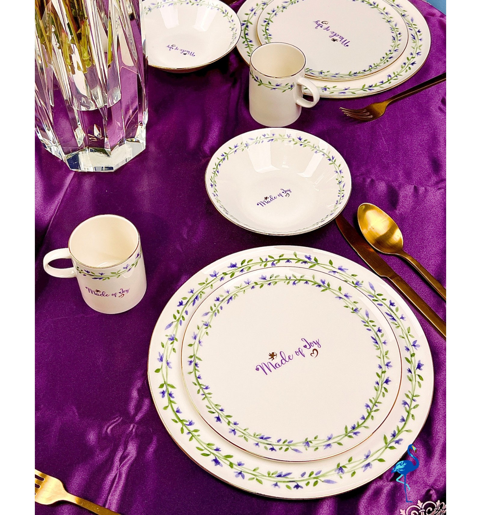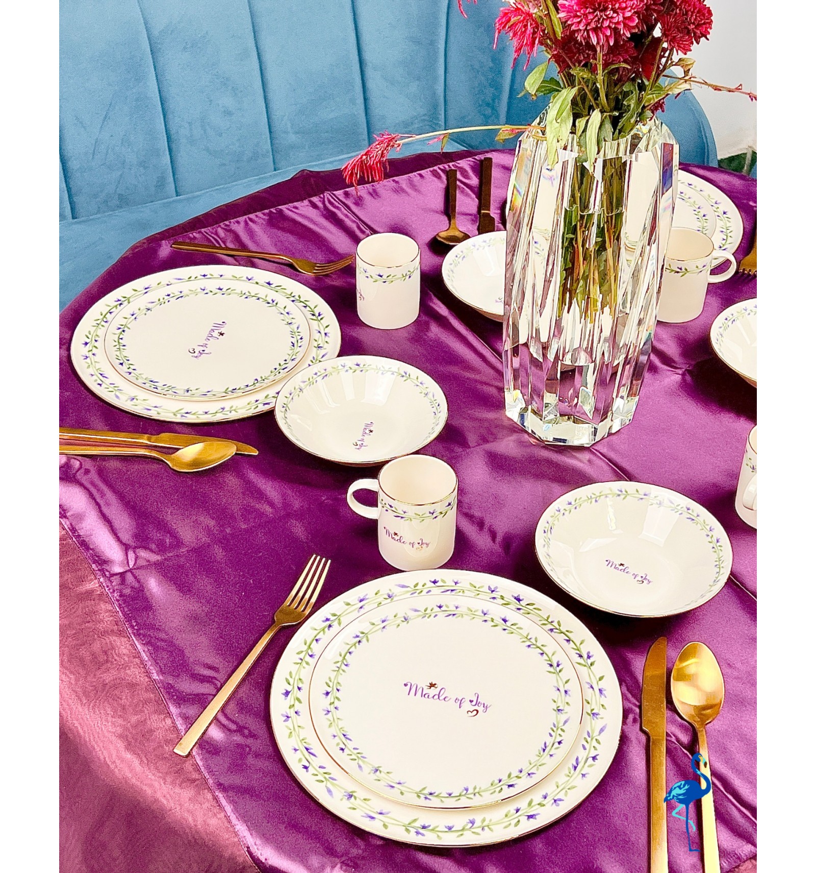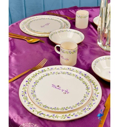 Chaque pièce est ornée de motifs floraux peints avec finesse, accompagnés d’une inscription centrale raffinée “Made of Joy”, symbole de bonheur et de convivialité. Ce service de table illumine votre décoration avec son style épuré, son éclat subtil et son charme intemporel.