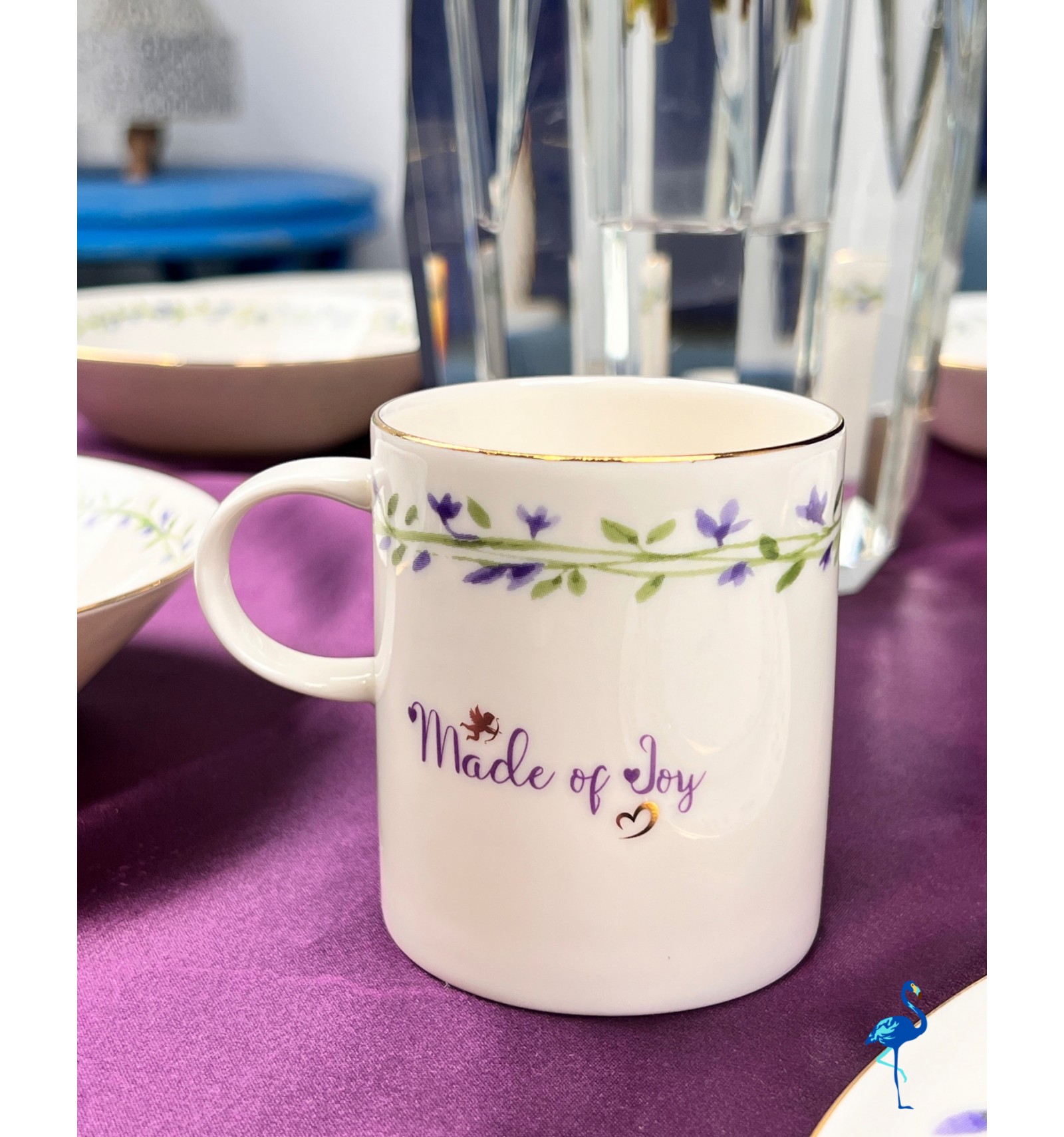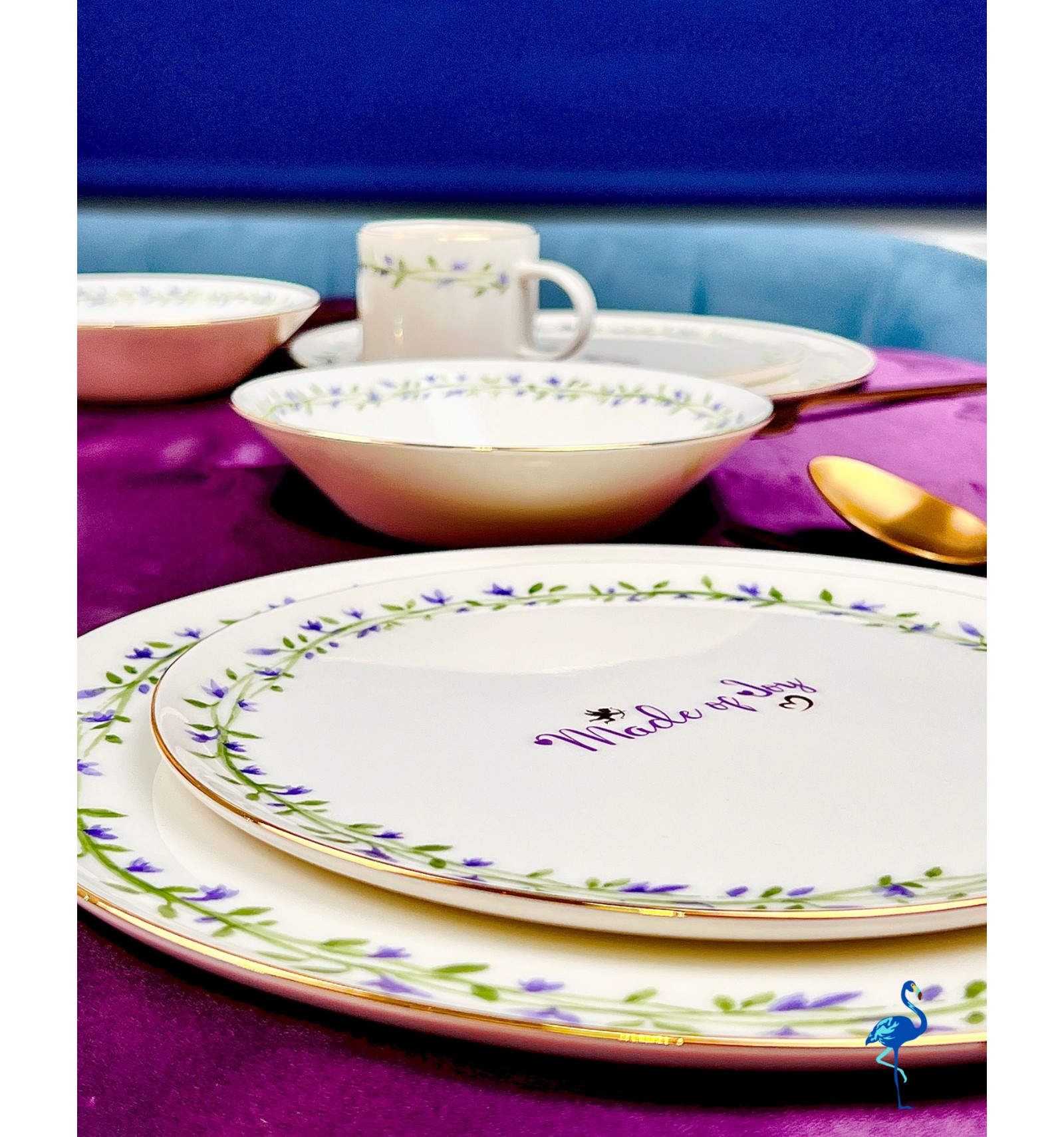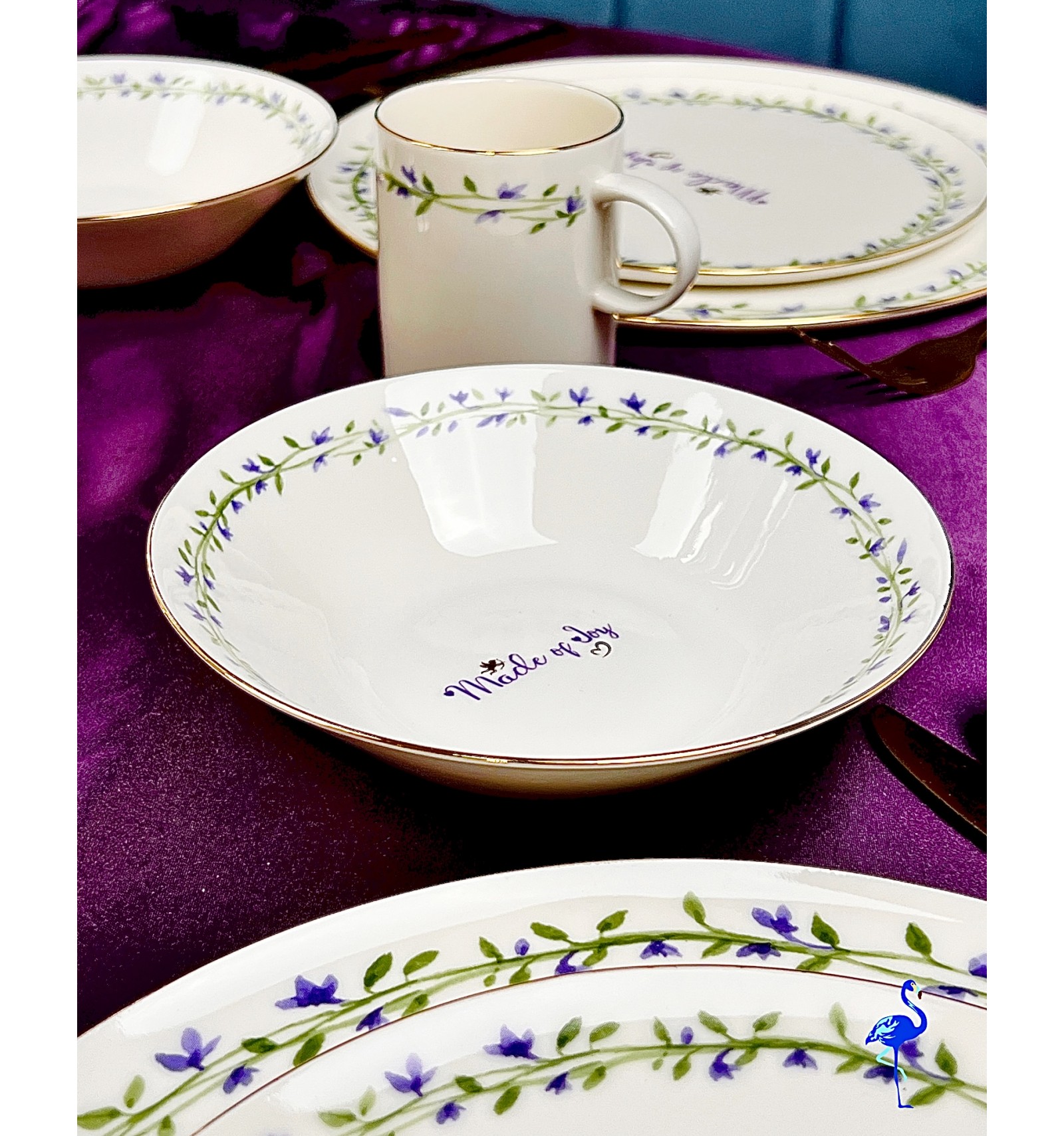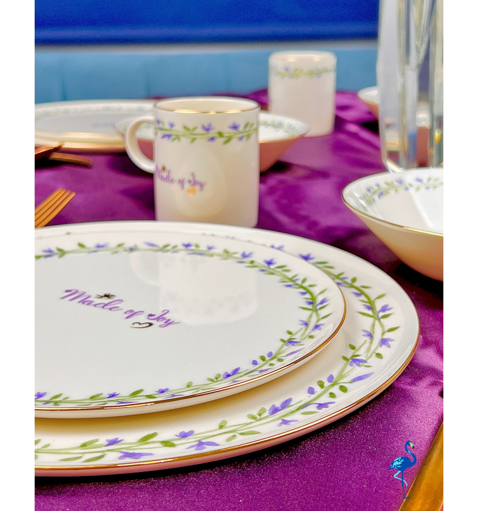 Chaque pièce est ornée de motifs floraux peints avec finesse, accompagnés d’une inscription centrale raffinée “Made of Joy”, symbole de bonheur et de convivialité. Ce service de table illumine votre décoration avec son style épuré, son éclat subtil et son charme intemporel.